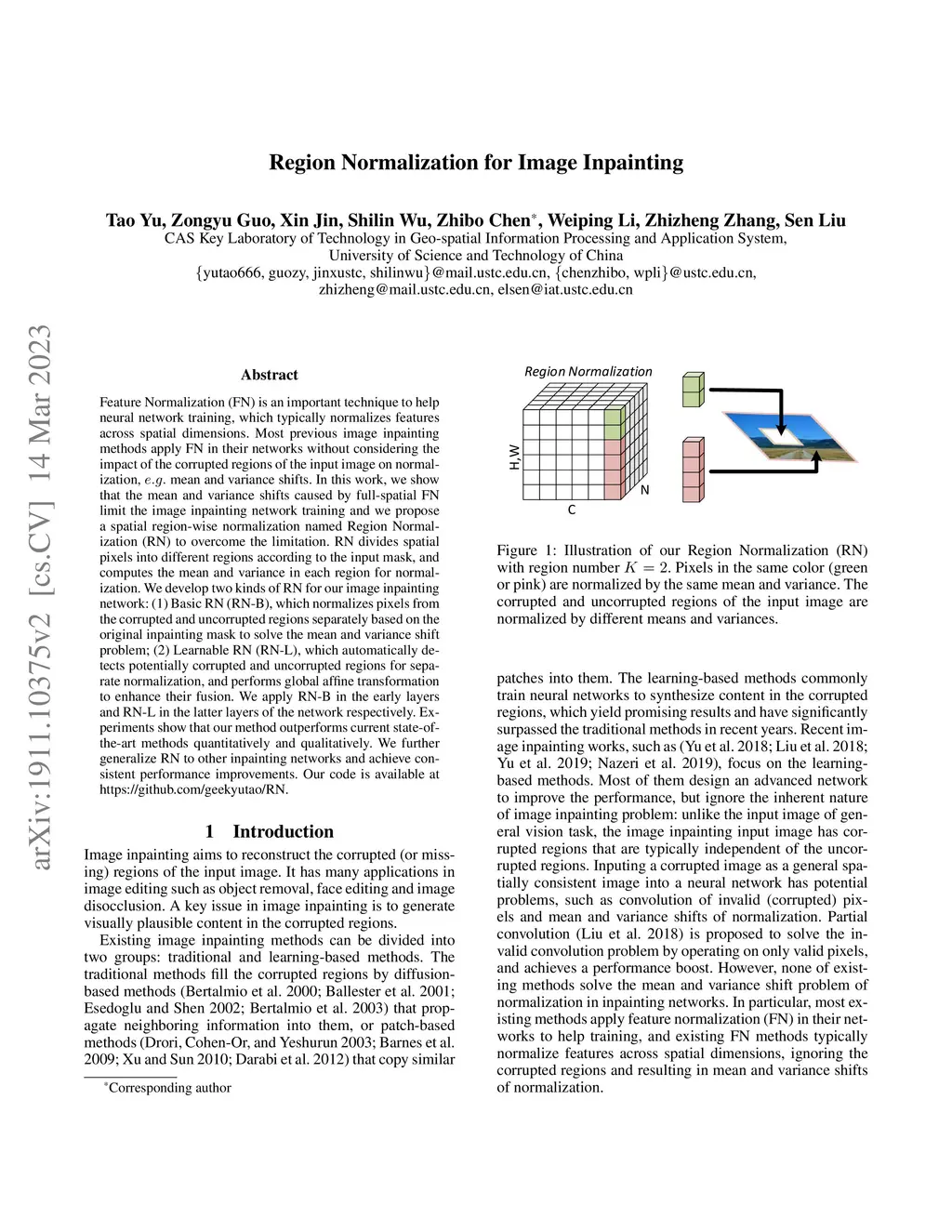 Feature Normalization (FN) is an important technique to help neural network training, which typically normalizes features across spatial dimensions. Most previous image inpainting methods apply FN in their networks without considering the impact of the corrupted regions of the input image on normalization, e.g. mean and variance shifts. In this work, we show that the mean and variance shifts caused by full-spatial FN limit the image inpainting network training and we propose a spatial region-wise normalization named Region Normalization (RN) to overcome the limitation. RN divides spatial pixels into different regions according to the input mask, and computes the mean and variance in each region for normalization. We develop two kinds of RN for our image inpainting network: (1) Basic RN (RN-B), which normalizes pixels from the corrupted and uncorrupted regions separately based on the original inpainting mask to solve the mean and variance shift problem; (2) Learnable RN (RN-L), which automatically detects potentially corrupted and uncorrupted regions for separate normalization, and performs global affine transformation to enhance their fusion. We apply RN-B in the early layers and RN-L in the latter layers of the network respectively. Experiments show that our method outperforms current state-of-the-art methods quantitatively and qualitatively. We further generalize RN to other inpainting networks and achieve consistent performance improvements. Our code is available at https://github.com/geekyutao/RN.