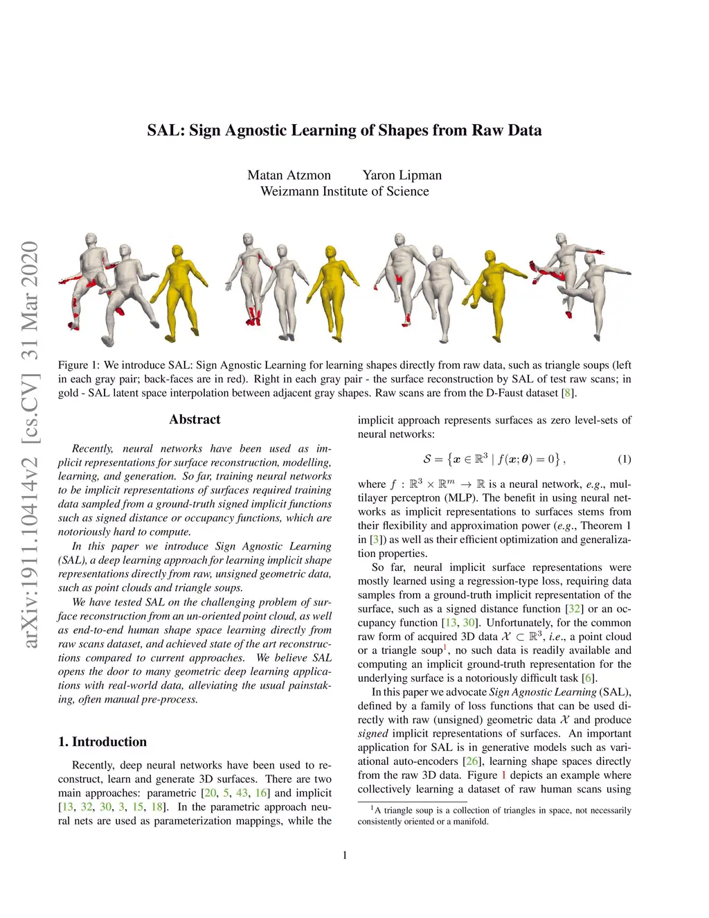 SAL: Sign Agnostic Learning of Shapes from Raw Data