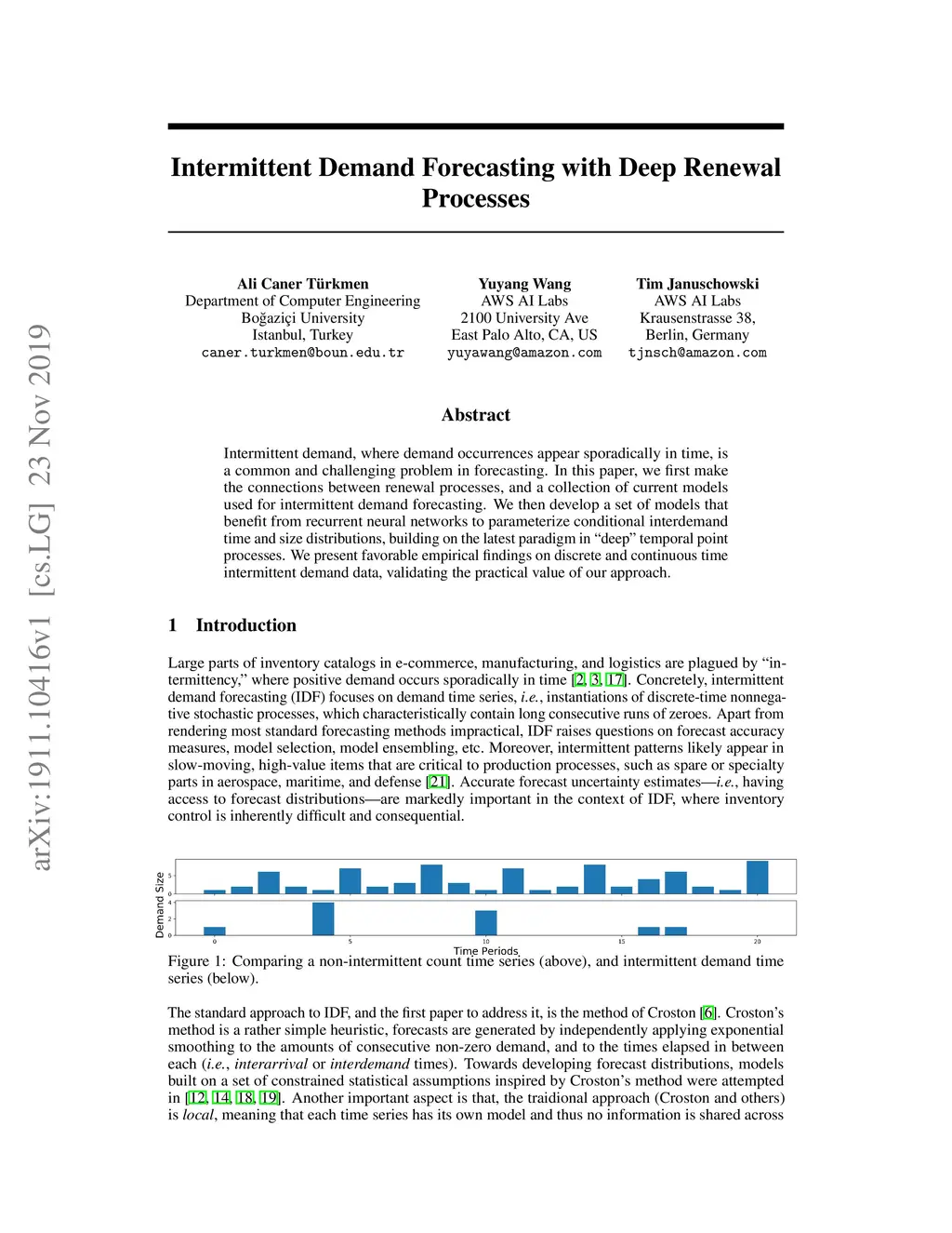 Intermittent demand, where demand occurrences appear sporadically in time, is a common and challenging problem in forecasting. In this paper, we first make the connections between renewal processes, and a collection of current models used for intermittent demand forecasting. We then develop a set of models that benefit from recurrent neural networks to parameterize conditional interdemand time and size distributions, building on the latest paradigm in "deep" temporal point processes. We present favorable empirical findings on discrete and continuous time intermittent demand data, validating the practical value of our approach.