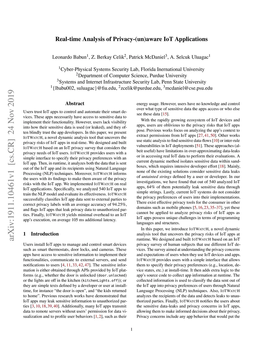 Users trust IoT apps to control and automate their smart devices. These apps necessarily have access to sensitive data to implement their functionality. However, users lack visibility into how their sensitive data is used (or leaked), and they often blindly trust the app developers. In this paper, we present IoTWatcH, a novel dynamic analysis tool that uncovers the privacy risks of IoT apps in real-time. We designed and built IoTWatcH based on an IoT privacy survey that considers the privacy needs of IoT users. IoTWatcH provides users with a simple interface to specify their privacy preferences with an IoT app. Then, in runtime, it analyzes both the data that is sent out of the IoT app and its recipients using Natural Language Processing (NLP) techniques. Moreover, IoTWatcH informs the users with its findings to make them aware of the privacy risks with the IoT app. We implemented IoTWatcH on real IoT applications. Specifically, we analyzed 540 IoT apps to train the NLP model and evaluate its effectiveness. IoTWatcH successfully classifies IoT app data sent to external parties to correct privacy labels with an average accuracy of 94.25%, and flags IoT apps that leak privacy data to unauthorized parties. Finally, IoTWatcH yields minimal overhead to an IoT app's execution, on average 105 ms additional latency.