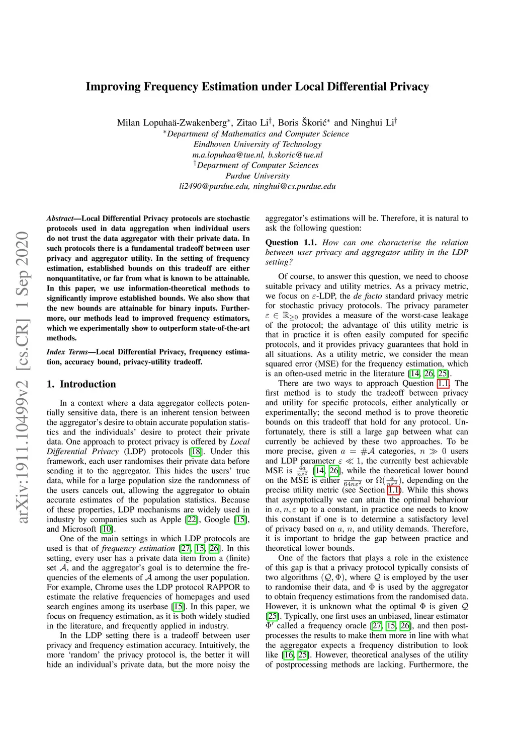 Local Differential Privacy protocols are stochastic protocols used in data aggregation when individual users do not trust the data aggregator with their private data. In such protocols there is a fundamental tradeoff between user privacy and aggregator utility. In the setting of frequency estimation, established bounds on this tradeoff are either nonquantitative, or far from what is known to be attainable. In this paper, we use information-theoretical methods to significantly improve established bounds. We also show that the new bounds are attainable for binary inputs. Furthermore, our methods lead to improved frequency estimators, which we experimentally show to outperform state-of-the-art methods.