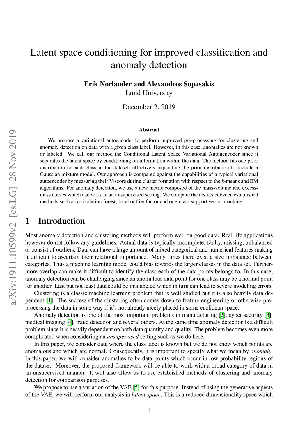 We propose a new type of variational autoencoder to perform improved pre-processing for clustering and anomaly detection on data with a given label. Anomalies however are not known or labeled. We call our method conditional latent space variational autonencoder since it separates the latent space by conditioning on information within the data. The method fits one prior distribution to each class in the dataset, effectively expanding the prior distribution to include a Gaussian mixture model. Our approach is compared against the capabilities of a typical variational autoencoder by measuring their V-score during cluster formation with respect to the k-means and EM algorithms. For anomaly detection, we use a new metric composed of the mass-volume and excess-mass curves which can work in an unsupervised setting. We compare the results between established methods such as as isolation forest, local outlier factor and one-class support vector machine.