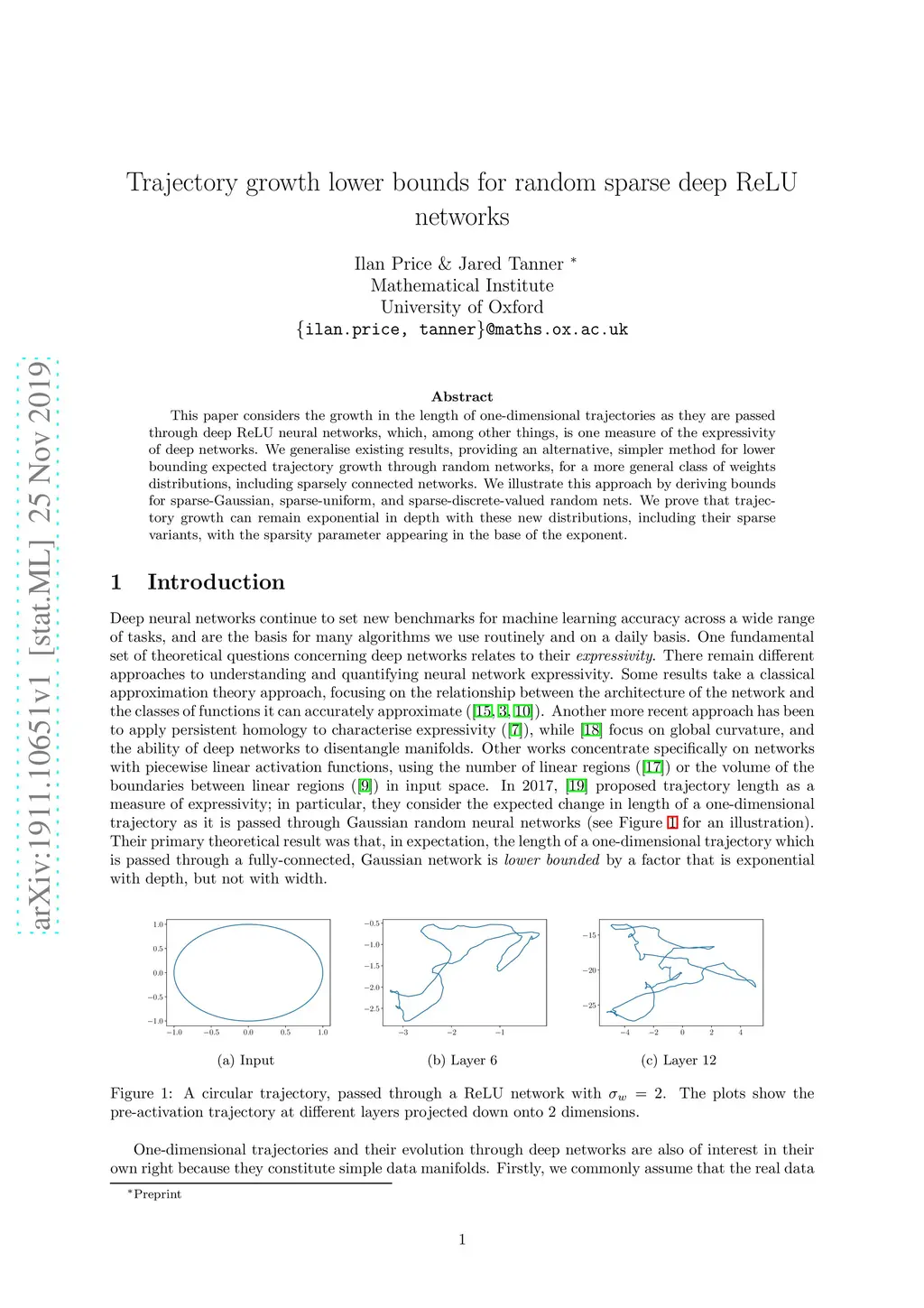 This paper considers the growth in the length of one-dimensional trajectories as they are passed through deep ReLU neural networks, which, among other things, is one measure of the expressivity of deep networks. We generalise existing results, providing an alternative, simpler method for lower bounding expected trajectory growth through random networks, for a more general class of weights distributions, including sparsely connected networks. We illustrate this approach by deriving bounds for sparse-Gaussian, sparse-uniform, and sparse-discrete-valued random nets. We prove that trajectory growth can remain exponential in depth with these new distributions, including their sparse variants, with the sparsity parameter appearing in the base of the exponent.