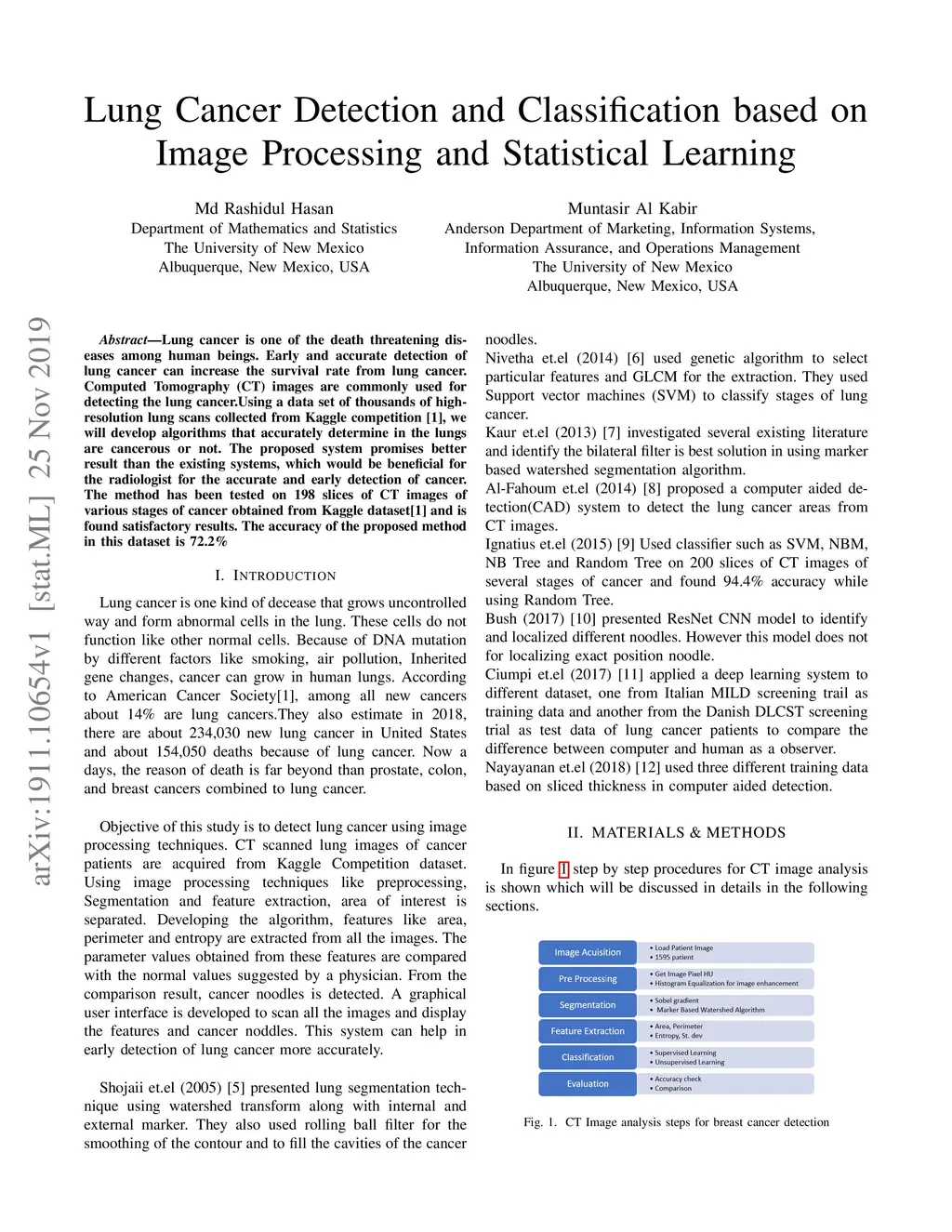 Lung cancer is one of the death threatening diseases among human beings. Early and accurate detection of lung cancer can increase the survival rate from lung cancer. Computed Tomography (CT) images are commonly used for detecting the lung cancer.Using a data set of thousands of high-resolution lung scans collected from Kaggle competition [1], we will develop algorithms that accurately determine in the lungs are cancerous or not. The proposed system promises better result than the existing systems, which would be beneficial for the radiologist for the accurate and early detection of cancer. The method has been tested on 198 slices of CT images of various stages of cancer obtained from Kaggle dataset[1] and is found satisfactory results. The accuracy of the proposed method in this dataset is 72.2%