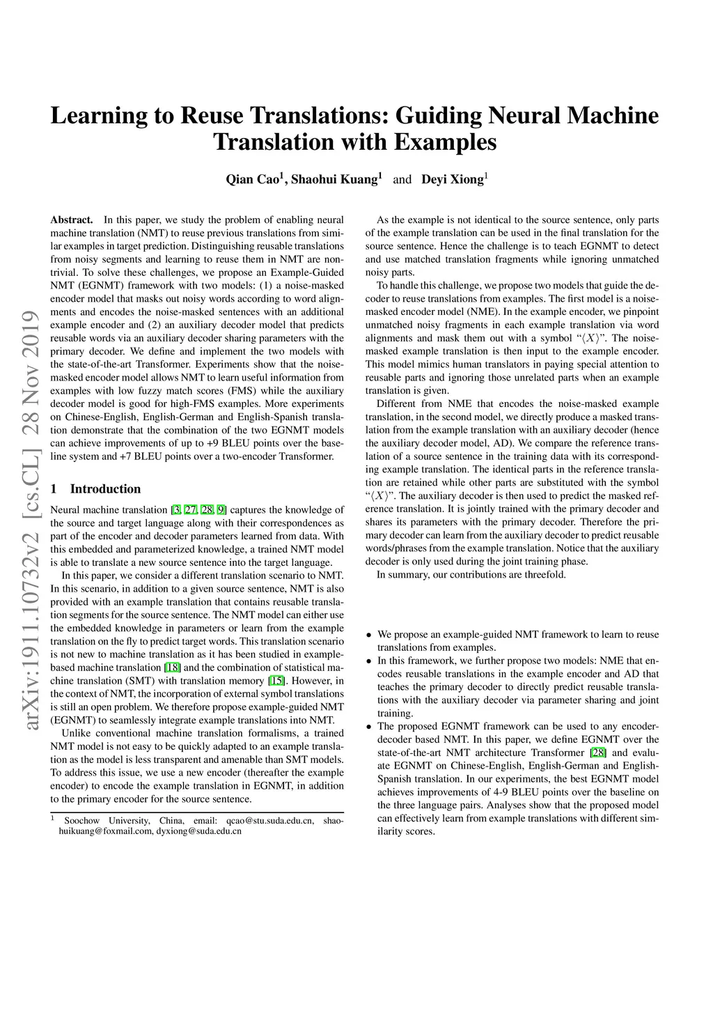 In this paper, we study the problem of enabling neural machine translation (NMT) to reuse previous translations from similar examples in target prediction. Distinguishing reusable translations from noisy segments and learning to reuse them in NMT are non-trivial. To solve these challenges, we propose an Example-Guided NMT (EGNMT) framework with two models: (1) a noise-masked encoder model that masks out noisy words according to word alignments and encodes the noise-masked sentences with an additional example encoder and (2) an auxiliary decoder model that predicts reusable words via an auxiliary decoder sharing parameters with the primary decoder. We define and implement the two models with the state-of-the-art Transformer. Experiments show that the noise-masked encoder model allows NMT to learn useful information from examples with low fuzzy match scores (FMS) while the auxiliary decoder model is good for high-FMS examples. More experiments on Chinese-English, English-German and English-Spanish translation demonstrate that the combination of the two EGNMT models can achieve improvements of up to +9 BLEU points over the baseline system and +7 BLEU points over a two-encoder Transformer.