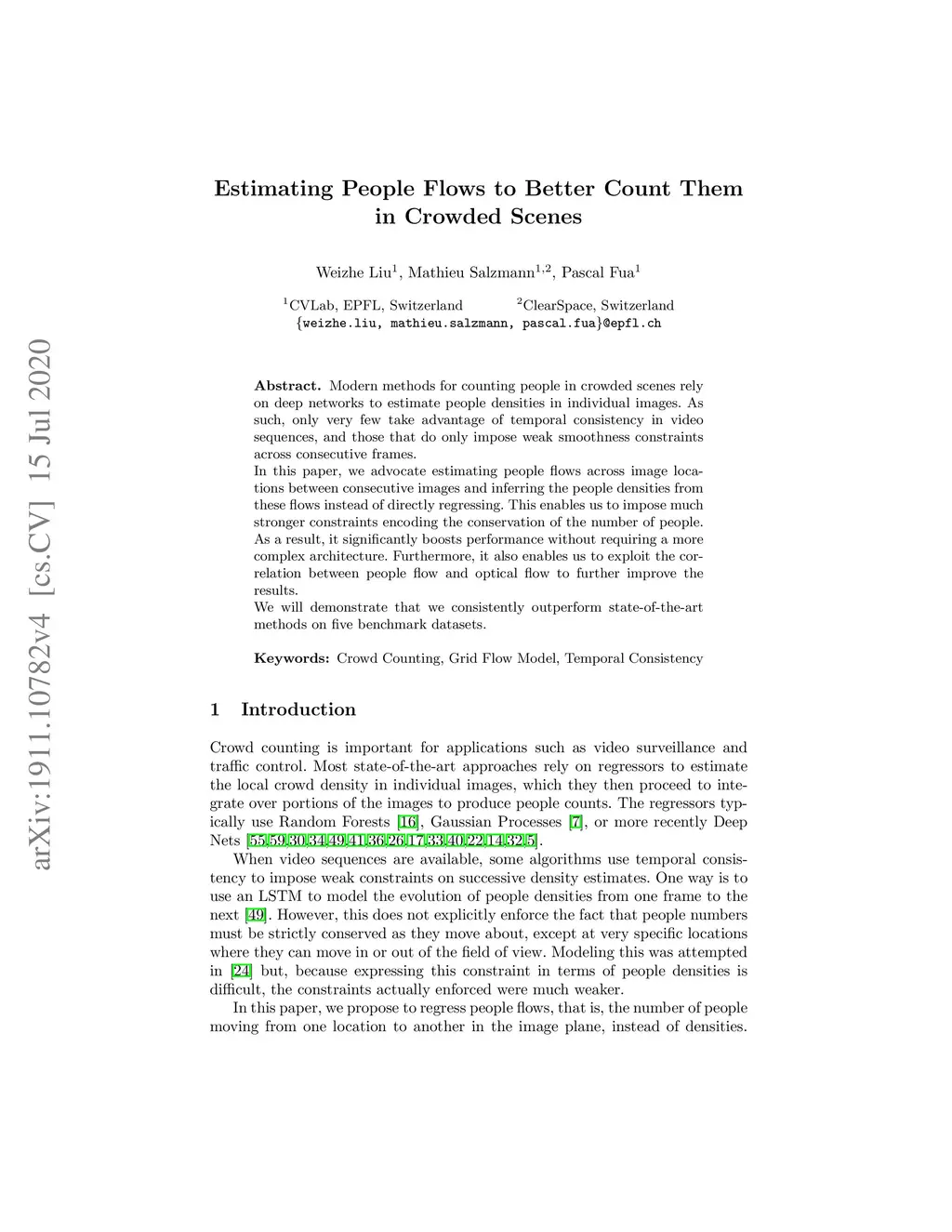Modern methods for counting people in crowded scenes rely on deep networks to estimate people densities in individual images. As such, only very few take advantage of temporal consistency in video sequences, and those that do only impose weak smoothness constraints across consecutive frames. In this paper, we advocate estimating people flows across image locations between consecutive images and inferring the people densities from these flows instead of directly regressing. This enables us to impose much stronger constraints encoding the conservation of the number of people. As a result, it significantly boosts performance without requiring a more complex architecture. Furthermore, it also enables us to exploit the correlation between people flow and optical flow to further improve the results. We will demonstrate that we consistently outperform state-of-the-art methods on five benchmark datasets.