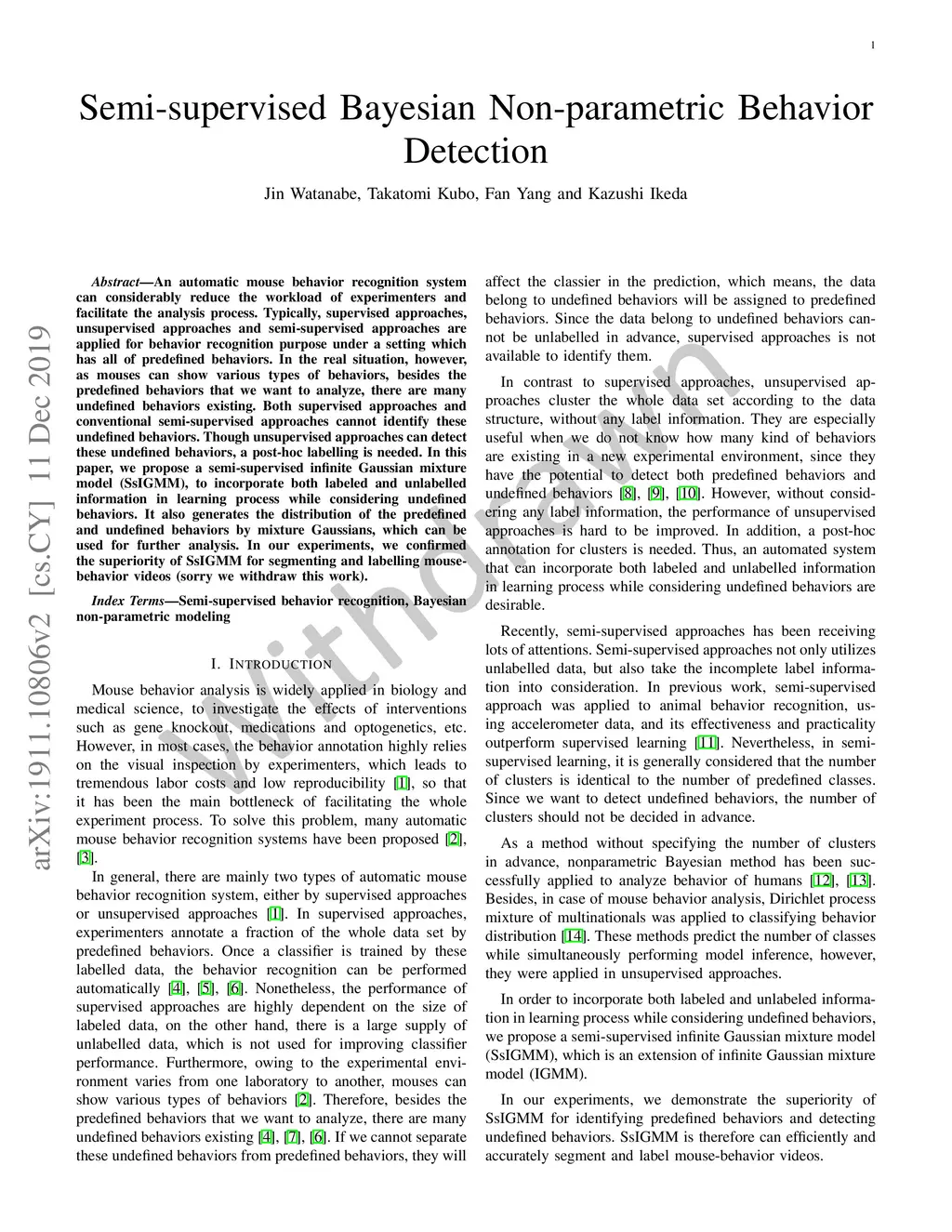 An automatic mouse behavior recognition system can considerably reduce the workload of experimenters and facilitate the analysis process. Typically, supervised approaches, unsupervised approaches and semi-supervised approaches are applied for behavior recognition purpose under a setting which has all of predefined behaviors. In the real situation, however, as mouses can show various types of behaviors, besides the predefined behaviors that we want to analyze, there are many undefined behaviors existing. Both supervised approaches and conventional semi-supervised approaches cannot identify these undefined behaviors. Though unsupervised approaches can detect these undefined behaviors, a post-hoc labeling is needed. In this paper, we propose a semi-supervised infinite Gaussian mixture model (SsIGMM), to incorporate both labeled and unlabelled information in learning process while considering undefined behaviors. It also generates the distribution of the predefined and undefined behaviors by mixture Gaussians, which can be used for further analysis. In our experiments, we confirmed the superiority of SsIGMM for segmenting and labelling mouse-behavior videos.