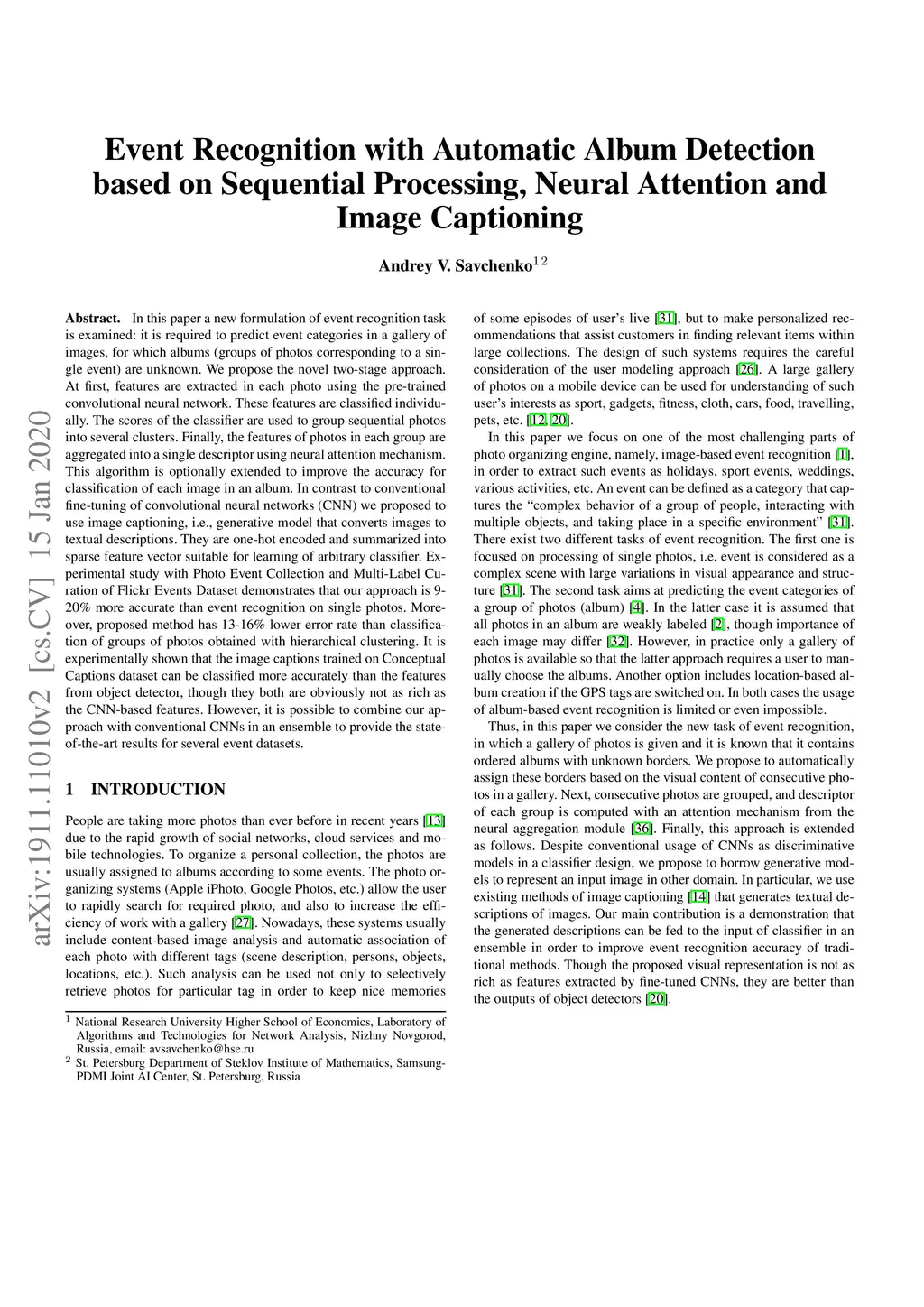 In this paper a new formulation of event recognition task is examined: it is required to predict event categories in a gallery of images, for which albums (groups of photos corresponding to a single event) are unknown. We propose the novel two-stage approach. At first, features are extracted in each photo using the pre-trained convolutional neural network. These features are classified individually. The scores of the classifier are used to group sequential photos into several clusters. Finally, the features of photos in each group are aggregated into a single descriptor using neural attention mechanism. This algorithm is optionally extended to improve the accuracy for classification of each image in an album. In contrast to conventional fine-tuning of convolutional neural networks (CNN) we proposed to use image captioning, i.e., generative model that converts images to textual descriptions. They are one-hot encoded and summarized into sparse feature vector suitable for learning of arbitrary classifier. Experimental study with Photo Event Collection and Multi-Label Curation of Flickr Events Dataset demonstrates that our approach is 9-20% more accurate than event recognition on single photos. Moreover, proposed method has 13-16% lower error rate than classification of groups of photos obtained with hierarchical clustering. It is experimentally shown that the image captions trained on Conceptual Captions dataset can be classified more accurately than the features from object detector, though they both are obviously not as rich as the CNN-based features. However, it is possible to combine our approach with conventional CNNs in an ensemble to provide the state-of-the-art results for several event datasets.