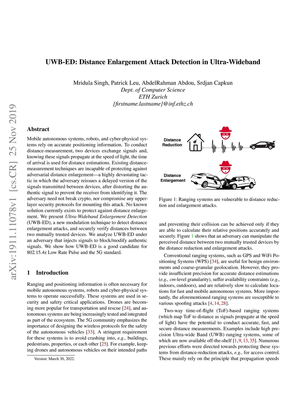 Mobile autonomous systems, robots, and cyber-physical systems rely on accurate positioning information. To conduct distance-measurement, two devices exchange signals and, knowing these signals propagate at the speed of light, the time of arrival is used for distance estimations. Existing distance-measurement techniques are incapable of protecting against adversarial distance enlargement---a highly devastating tactic in which the adversary reissues a delayed version of the signals transmitted between devices, after distorting the authentic signal to prevent the receiver from identifying it. The adversary need not break crypto, nor compromise any upper-layer security protocols for mounting this attack. No known solution currently exists to protect against distance enlargement. We present \textit{Ultra-Wideband Enlargement Detection} (UWB-ED), a new modulation technique to detect distance enlargement attacks, and securely verify distances between two mutually trusted devices. We analyze UWB-ED under an adversary that injects signals to block/modify authentic signals. We show how UWB-ED is a good candidate for 802.15.4z Low Rate Pulse and the 5G standard.