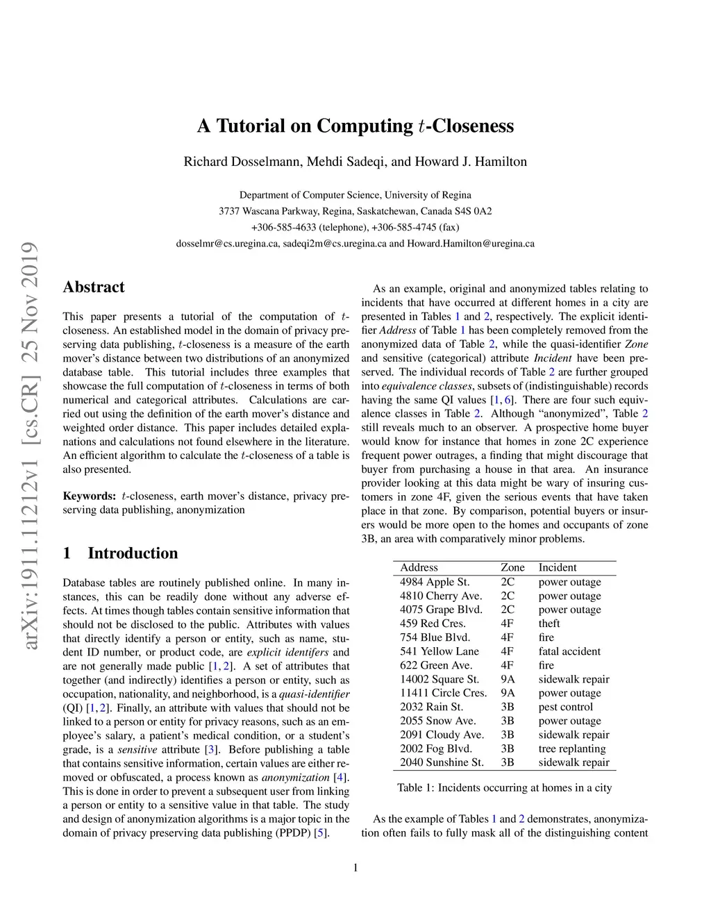 This paper presents a tutorial of the computation of -closeness. An established model in the domain of privacy preserving data publishing, -closeness is a measure of the earth mover's distance between two distributions of an anonymized database table. This tutorial includes three examples that showcase the full computation of -closeness in terms of both numerical and categorical attributes. Calculations are carried out using the definition of the earth mover's distance and weighted order distance. This paper includes detailed explanations and calculations not found elsewhere in the literature. An efficient algorithm to calculate the -closeness of a table is also presented.