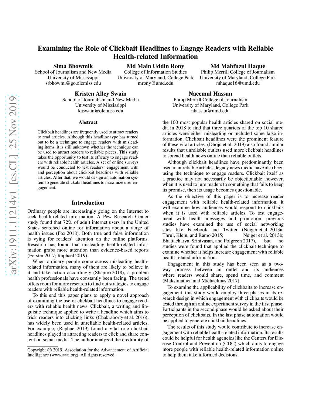 Clickbait headlines are frequently used to attract readers to read articles. Although this headline type has turned out to be a technique to engage readers with misleading items, it is still unknown whether the technique can be used to attract readers to reliable pieces. This study takes the opportunity to test its efficacy to engage readers with reliable health articles. A set of online surveys would be conducted to test readers' engagement with and perception about clickbait headlines with reliable articles. After that, we would design an automation system to generate clickabit headlines to maximize user engagement.