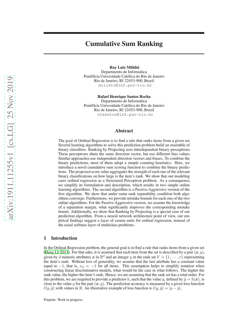 The goal of Ordinal Regression is to find a rule that ranks items from a given set. Several learning algorithms to solve this prediction problem build an ensemble of binary classifiers. Ranking by Projecting uses interdependent binary perceptrons. These perceptrons share the same direction vector, but use different bias values. Similar approaches use independent direction vectors and biases. To combine the binary predictions, most of them adopt a simple counting heuristics. Here, we introduce a novel cumulative sum scoring function to combine the binary predictions. The proposed score value aggregates the strength of each one of the relevant binary classifications on how large is the item's rank. We show that our modeling casts ordinal regression as a Structured Perceptron problem. As a consequence, we simplify its formulation and description, which results in two simple online learning algorithms. The second algorithm is a Passive-Aggressive version of the first algorithm. We show that under some rank separability condition both algorithms converge. Furthermore, we provide mistake bounds for each one of the two online algorithms. For the Passive-Aggressive version, we assume the knowledge of a separation margin, what significantly improves the corresponding mistake bound. Additionally, we show that Ranking by Projecting is a special case of our prediction algorithm. From a neural network architecture point of view, our empirical findings suggest a layer of cusum units for ordinal regression, instead of the usual softmax layer of multiclass problems.
