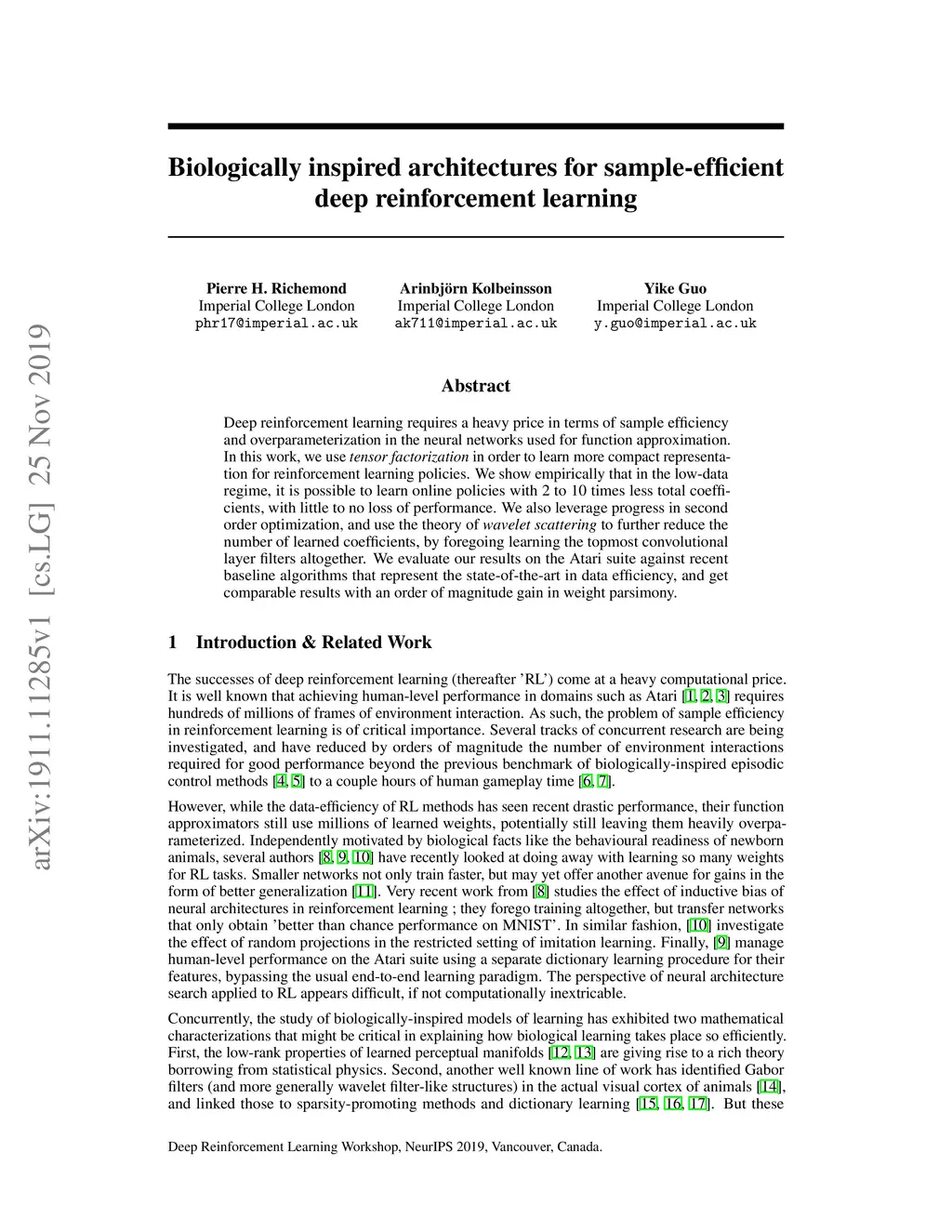 Deep reinforcement learning requires a heavy price in terms of sample efficiency and overparameterization in the neural networks used for function approximation. In this work, we use tensor factorization in order to learn more compact representation for reinforcement learning policies. We show empirically that in the low-data regime, it is possible to learn online policies with 2 to 10 times less total coefficients, with little to no loss of performance. We also leverage progress in second order optimization, and use the theory of wavelet scattering to further reduce the number of learned coefficients, by foregoing learning the topmost convolutional layer filters altogether. We evaluate our results on the Atari suite against recent baseline algorithms that represent the state-of-the-art in data efficiency, and get comparable results with an order of magnitude gain in weight parsimony.