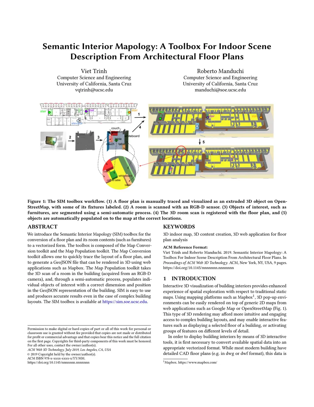 We introduce the Semantic Interior Mapology (SIM) toolbox for the conversion of a floor plan and its room contents (such as furnitures) to a vectorized form. The toolbox is composed of the Map Conversion toolkit and the Map Population toolkit. The Map Conversion toolkit allows one to quickly trace the layout of a floor plan, and to generate a GeoJSON file that can be rendered in 3D using web applications such as Mapbox. The Map Population toolkit takes the 3D scan of a room in the building (acquired from an RGB-D camera), and, through a semi-automatic process, populates individual objects of interest with a correct dimension and position in the GeoJSON representation of the building. SIM is easy to use and produces accurate results even in the case of complex building layouts.
