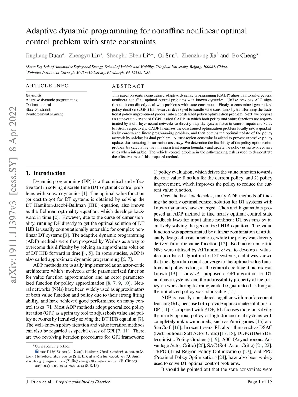 This paper presents a constrained adaptive dynamic programming (CADP) algorithm to solve general nonlinear nonaffine optimal control problems with known dynamics. Unlike previous ADP algorithms, it can directly deal with problems with state constraints. Firstly, a constrained generalized policy iteration (CGPI) framework is developed to handle state constraints by transforming the traditional policy improvement process into a constrained policy optimization problem. Next, we propose an actor-critic variant of CGPI, called CADP, in which both policy and value functions are approximated by multi-layer neural networks to directly map the system states to control inputs and value function, respectively. CADP linearizes the constrained optimization problem locally into a quadratically constrained linear programming problem, and then obtains the optimal update of the policy network by solving its dual problem. A trust region constraint is added to prevent excessive policy update, thus ensuring linearization accuracy. We determine the feasibility of the policy optimization problem by calculating the minimum trust region boundary and update the policy using two recovery rules when infeasible. The vehicle control problem in the path-tracking task is used to demonstrate the effectiveness of this proposed method.