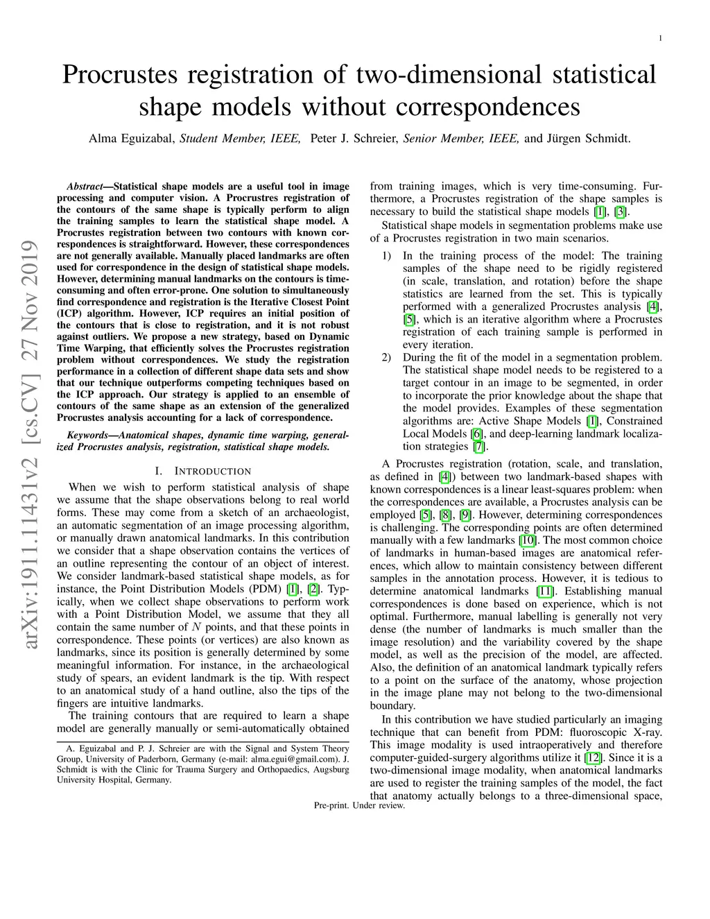 Statistical shape models are a useful tool in image processing and computer vision. A Procrustres registration of the contours of the same shape is typically perform to align the training samples to learn the statistical shape model. A Procrustes registration between two contours with known correspondences is straightforward. However, these correspondences are not generally available. Manually placed landmarks are often used for correspondence in the design of statistical shape models. However, determining manual landmarks on the contours is time-consuming and often error-prone. One solution to simultaneously find correspondence and registration is the Iterative Closest Point (ICP) algorithm. However, ICP requires an initial position of the contours that is close to registration, and it is not robust against outliers. We propose a new strategy, based on Dynamic Time Warping, that efficiently solves the Procrustes registration problem without correspondences. We study the registration performance in a collection of different shape data sets and show that our technique outperforms competing techniques based on the ICP approach. Our strategy is applied to an ensemble of contours of the same shape as an extension of the generalized Procrustes analysis accounting for a lack of correspondence.