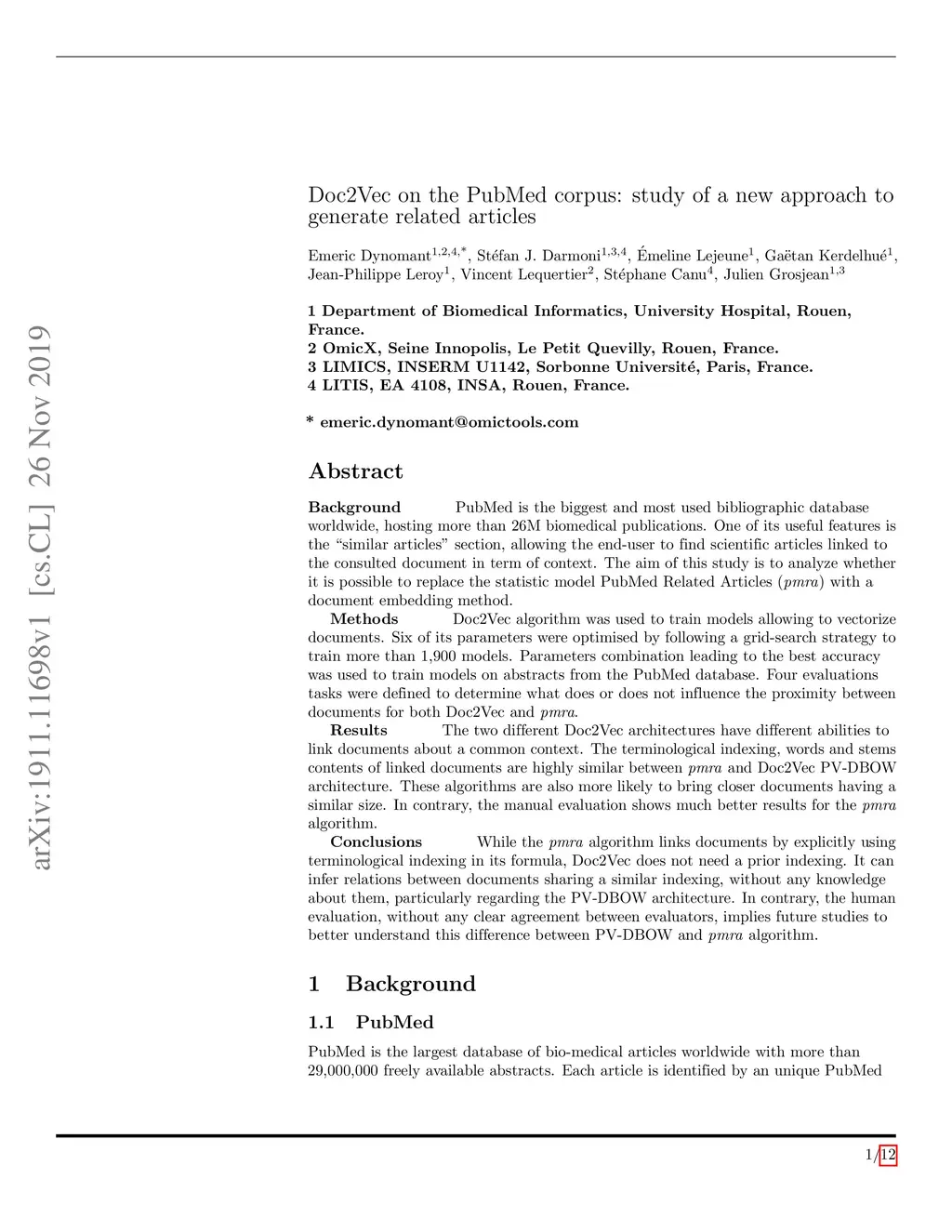 Doc2Vec on the PubMed corpus: study of a new approach to generate