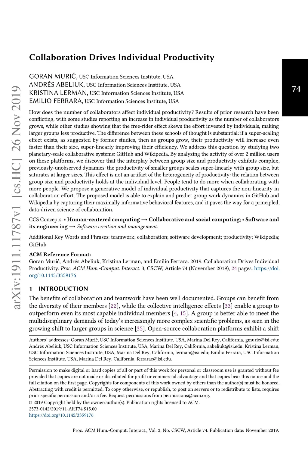 How does the number of collaborators affect individual productivity? Results of prior research have been conflicting, with some studies reporting an increase in individual productivity as the number of collaborators grows, while other studies showing that the {free-rider effect} skews the effort invested by individuals, making larger groups less productive. The difference between these schools of thought is substantial: if a super-scaling effect exists, as suggested by former studies, then as groups grow, their productivity will increase even faster than their size, super-linearly improving their efficiency. We address this question by studying two planetary-scale collaborative systems: GitHub and Wikipedia. By analyzing the activity of over 2 million users on these platforms, we discover that the interplay between group size and productivity exhibits complex, previously-unobserved dynamics: the productivity of smaller groups scales super-linearly with group size, but saturates at larger sizes. This effect is not an artifact of the heterogeneity of productivity: the relation between group size and productivity holds at the individual level. People tend to do more when collaborating with more people. We propose a generative model of individual productivity that captures the non-linearity in collaboration effort. The proposed model is able to explain and predict group work dynamics in GitHub and Wikipedia by capturing their maximally informative behavioral features, and it paves the way for a principled, data-driven science of collaboration.