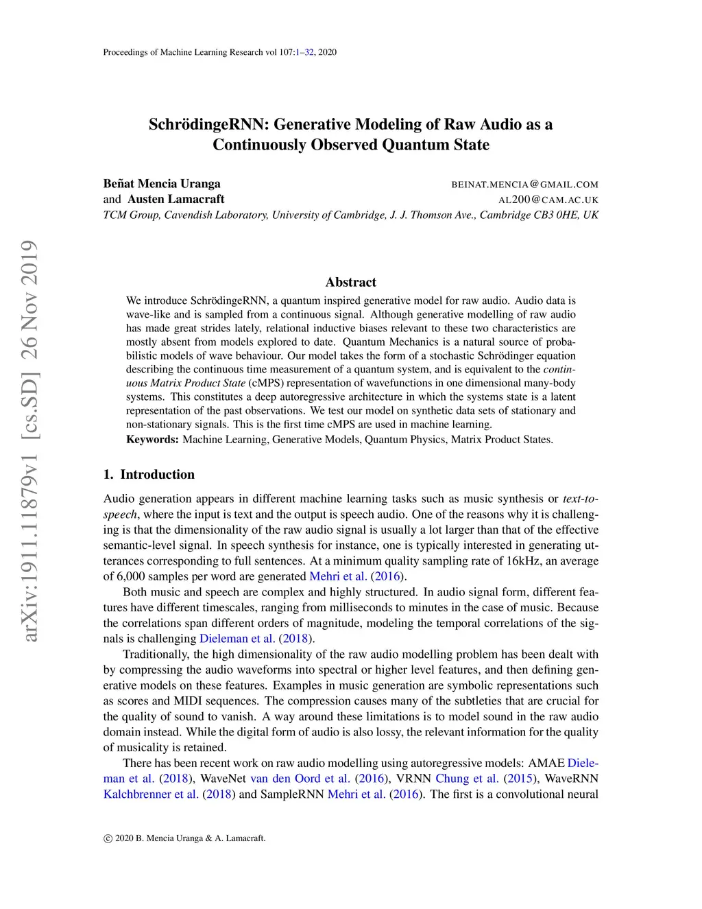 SchrödingeRNN: Generative Modeling of Raw Audio as a Continuously
