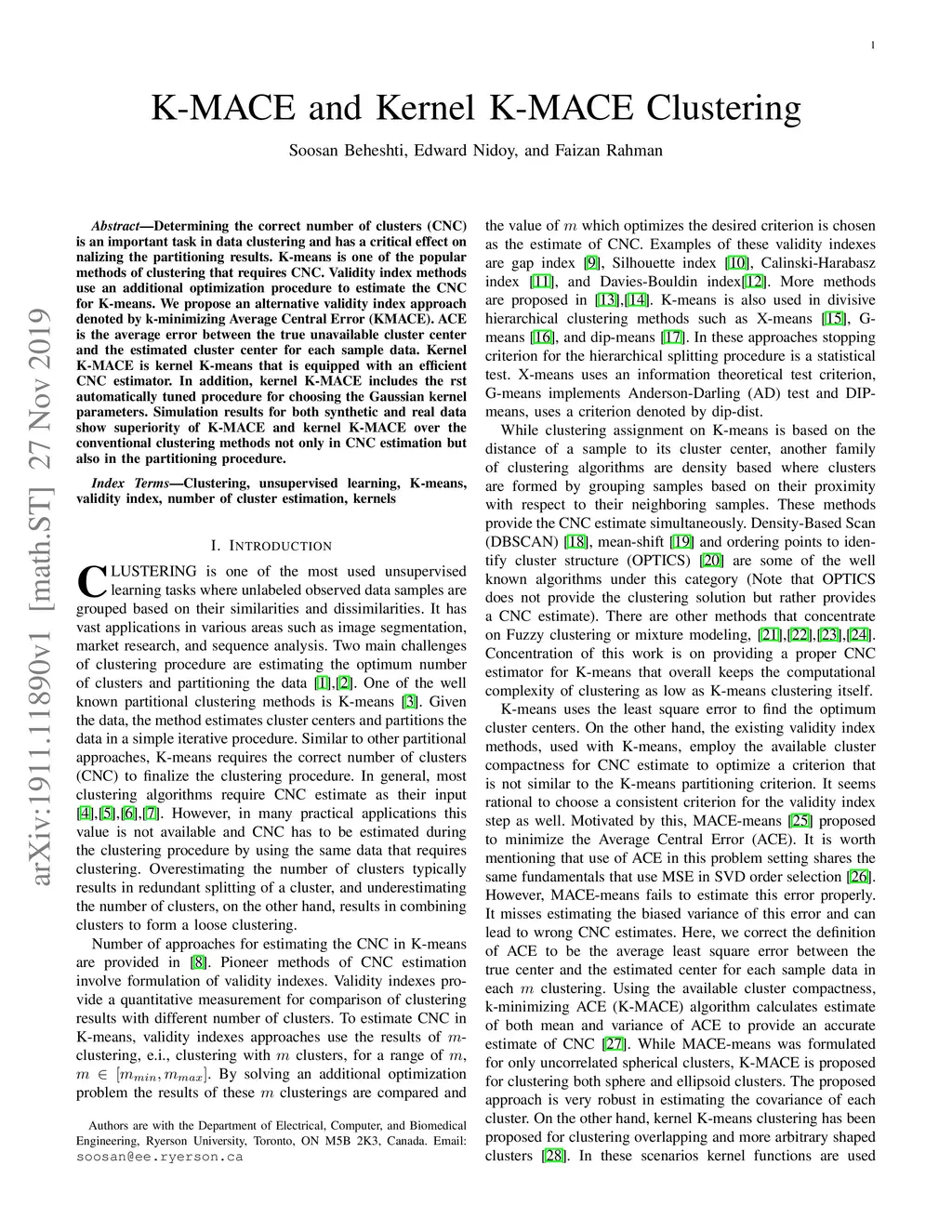 Determining the correct number of clusters (CNC) is an important task in data clustering and has a critical effect on finalizing the partitioning results. K-means is one of the popular methods of clustering that requires CNC. Validity index methods use an additional optimization procedure to estimate the CNC for K-means. We propose an alternative validity index approach denoted by k-minimizing Average Central Error (KMACE). K-means is one of the popular methods of clustering that requires CNC. Validity ACE is the average error between the true unavailable cluster center and the estimated cluster center for each sample data. Kernel K-MACE is kernel K-means that is equipped with an efficient CNC estimator. In addition, kernel K_MACE includes the first automatically tuned procedure for choosing the Gaussian kernel parameters. Simulation results for both synthetic and read data show superiority of K_MACE and kernel K-MACE over the conventional clustering methods not only in CNC estimation but also in the partitioning procedure.