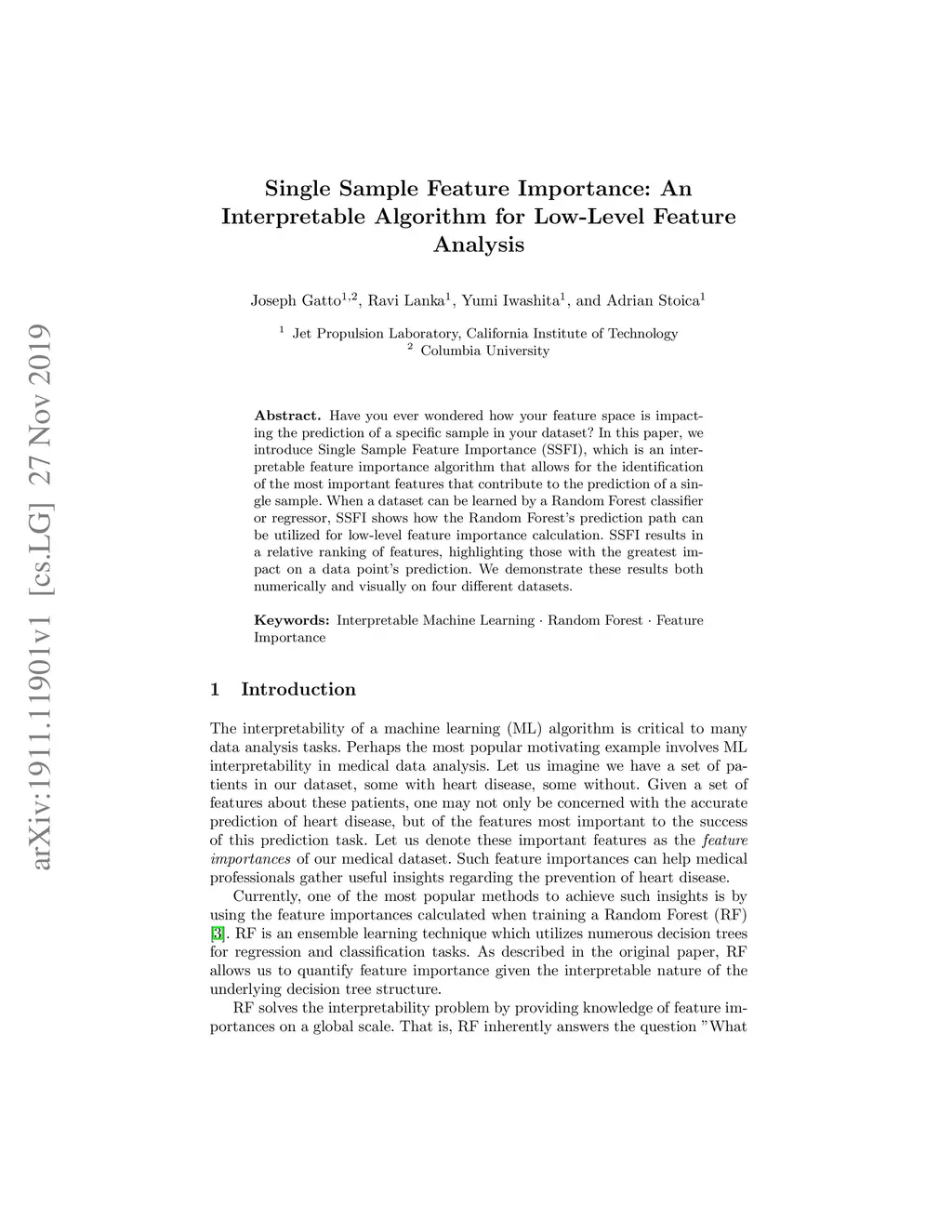 Have you ever wondered how your feature space is impacting the prediction of a specific sample in your dataset? In this paper, we introduce Single Sample Feature Importance (SSFI), which is an interpretable feature importance algorithm that allows for the identification of the most important features that contribute to the prediction of a single sample. When a dataset can be learned by a Random Forest classifier or regressor, SSFI shows how the Random Forest's prediction path can be utilized for low-level feature importance calculation. SSFI results in a relative ranking of features, highlighting those with the greatest impact on a data point's prediction. We demonstrate these results both numerically and visually on four different datasets.