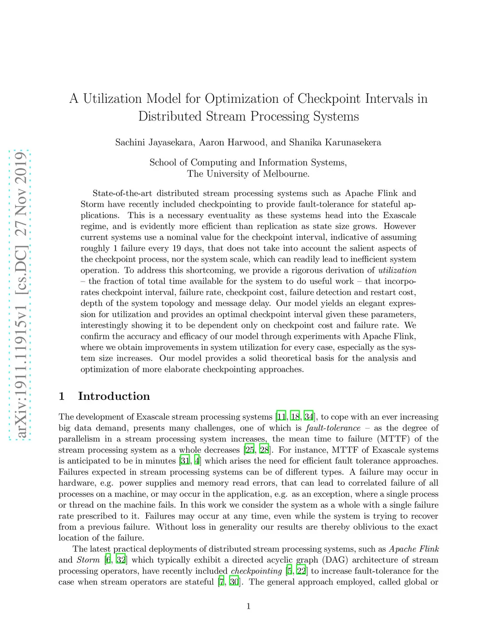 State-of-the-art distributed stream processing systems such as Apache Flink and Storm have recently included checkpointing to provide fault-tolerance for stateful applications. This is a necessary eventuality as these systems head into the Exascale regime, and is evidently more efficient than replication as state size grows. However current systems use a nominal value for the checkpoint interval, indicative of assuming roughly 1 failure every 19 days, that does not take into account the salient aspects of the checkpoint process, nor the system scale, which can readily lead to inefficient system operation. To address this shortcoming, we provide a rigorous derivation of utilization -- the fraction of total time available for the system to do useful work -- that incorporates checkpoint interval, failure rate, checkpoint cost, failure detection and restart cost, depth of the system topology and message delay. Our model yields an elegant expression for utilization and provides an optimal checkpoint interval given these parameters, interestingly showing it to be dependent only on checkpoint cost and failure rate. We confirm the accuracy and efficacy of our model through experiments with Apache Flink, where we obtain improvements in system utilization for every case, especially as the system size increases. Our model provides a solid theoretical basis for the analysis and optimization of more elaborate checkpointing approaches.