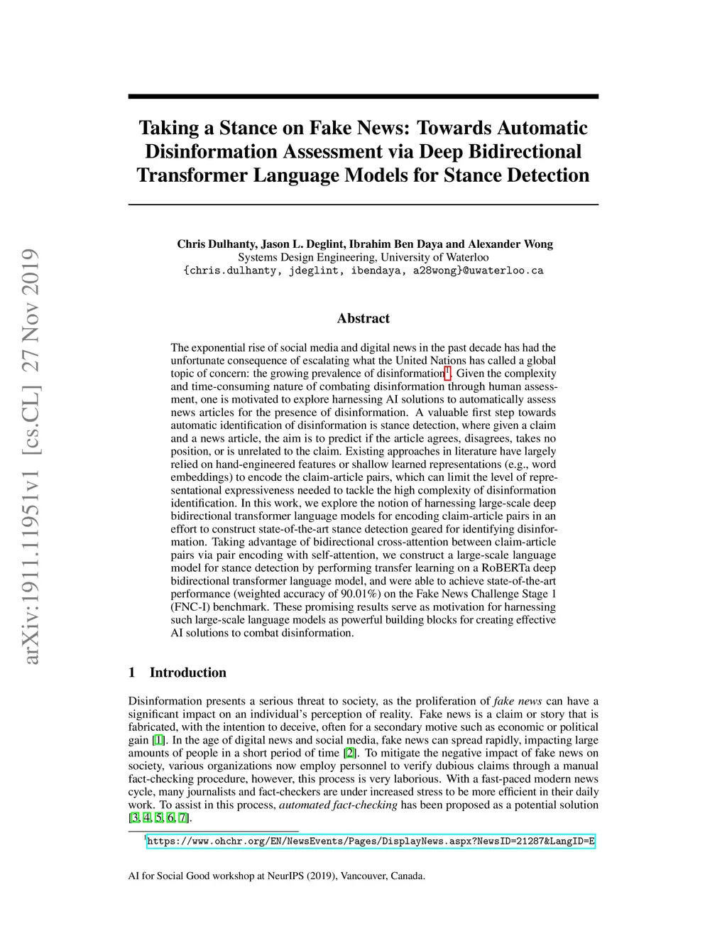 Assessment via Deep Bidirectional Transformer Language Models for Stance