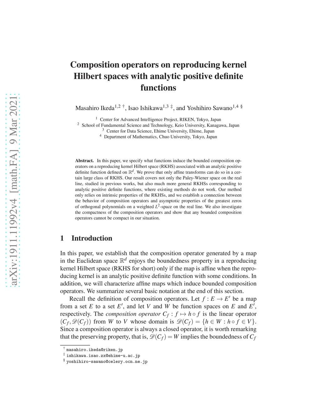 In this paper, we specifyIn this paper, we specify what functions induce the bounded composition operators on a reproducing kernel Hilbert space (RKHS) associated with an analytic positive definite function defined on . We prove that only affine transforms can do so in a pretty large class of RKHS. Our result covers not only the Paley-Wiener space on the real line, studied in previous works, but also much more general RKHSs corresponding to analytic positive definite functions. Our method only relies on an intrinsic properties of the RKHSs, and we establish a connection between the behavior of composition operators and the asymptotic properties of the greatest zeros of orthogonal polynomials on a weighted -spaces on the real line. We also investigate the compactness of the composition operators and show that any bounded composition operators cannot be compact in our situation.