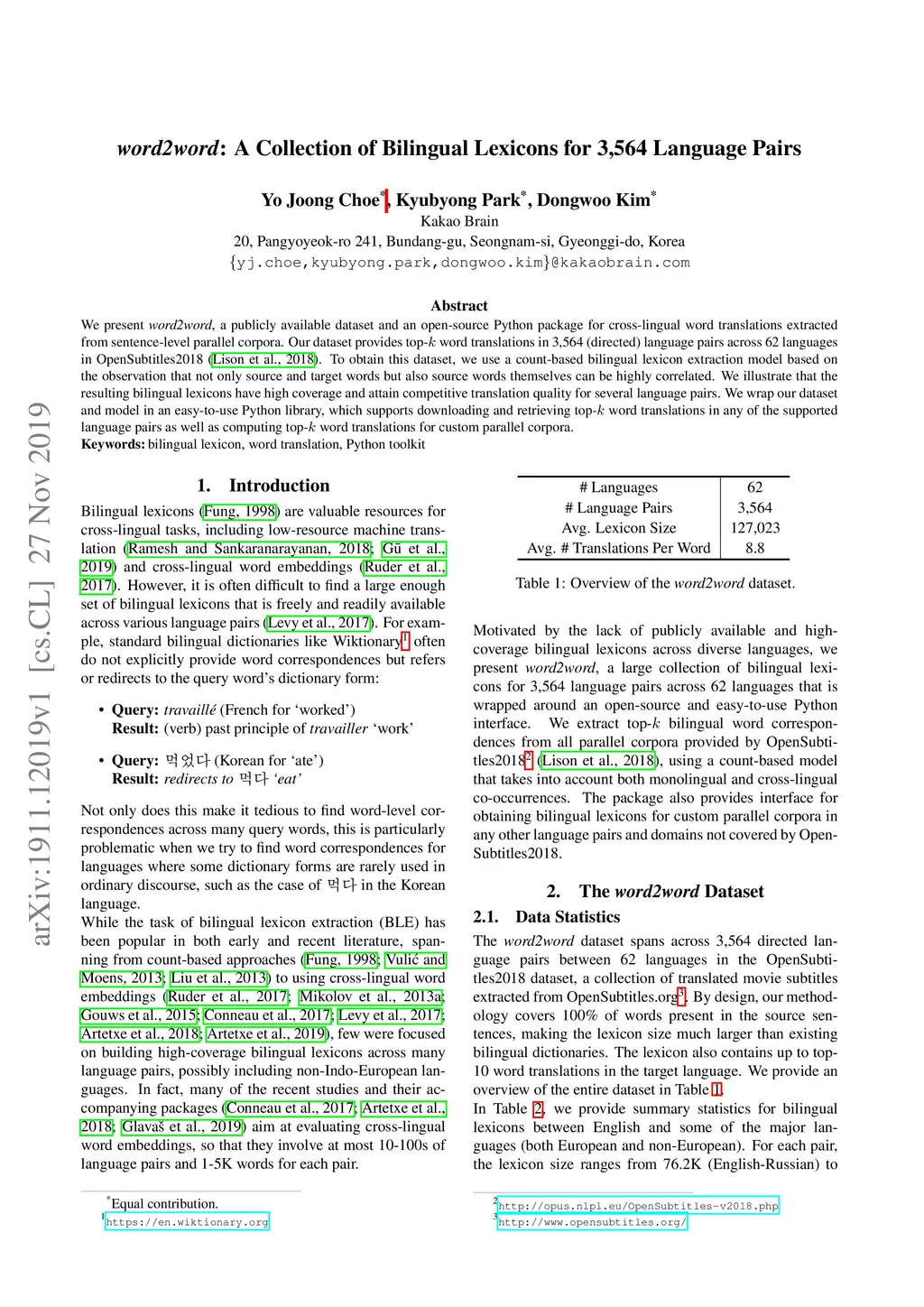 We present word2word, a publicly available dataset and an open-source Python package for cross-lingual word translations extracted from sentence-level parallel corpora. Our dataset provides top-k word translations in 3,564 (directed) language pairs across 62 languages in OpenSubtitles2018 (Lison et al., 2018). To obtain this dataset, we use a count-based bilingual lexicon extraction model based on the observation that not only source and target words but also source words themselves can be highly correlated. We illustrate that the resulting bilingual lexicons have high coverage and attain competitive translation quality for several language pairs. We wrap our dataset and model in an easy-to-use Python library, which supports downloading and retrieving top-k word translations in any of the supported language pairs as well as computing top-k word translations for custom parallel corpora.