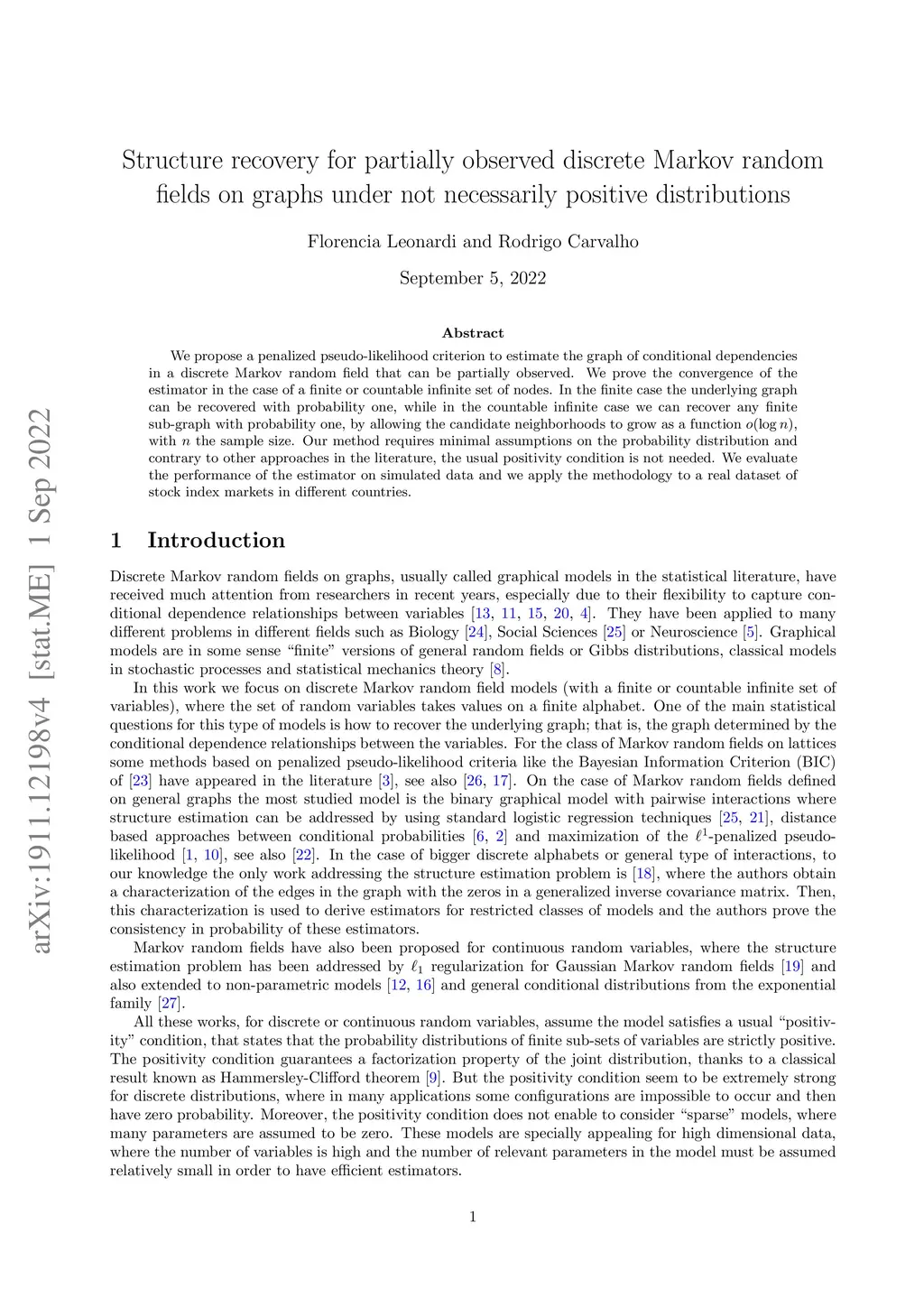 We propose a penalized pseudo-likelihood criterion to estimate the graph of conditional dependencies in a discrete Markov random field that can be partially observed. We prove the convergence of the estimator in the case of a finite or countable infinite set of nodes. In the finite case, the underlying graph can be recovered with probability one, while in the countable infinite case, we can recover any finite sub-graph with probability one by allowing the candidate neighborhoods to grow as a function o(log n), with n the sample size. Our method requires minimal assumptions on the probability distribution, and contrary to other approaches in the literature, the usual positivity condition is not needed. We evaluate the performance of the estimator on simulated data, and we apply the methodology to a real dataset of stock index markets in different countries.