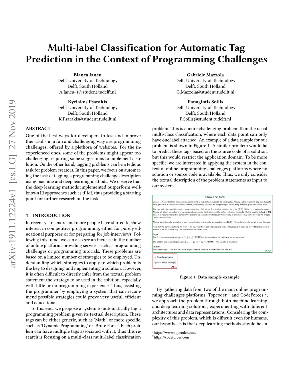 One of the best ways for developers to test and improve their skills in a fun and challenging way are programming challenges, offered by a plethora of websites. For the inexperienced ones, some of the problems might appear too challenging, requiring some suggestions to implement a solution. On the other hand, tagging problems can be a tedious task for problem creators. In this paper, we focus on automating the task of tagging a programming challenge description using machine and deep learning methods. We observe that the deep learning methods implemented outperform well-known IR approaches such as tf-idf, thus providing a starting point for further research on the task.