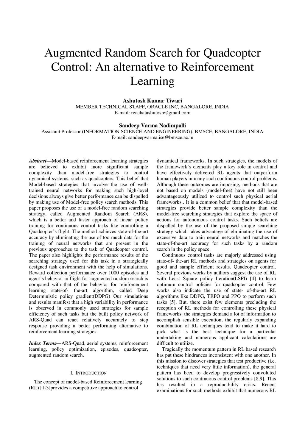 Model-based reinforcement learning strategies are believed to exhibit more significant sample complexity than model-free strategies to control dynamical systems,such as quadcopters.This belief that Model-based strategies that involve the use of well-trained neural networks for making such high-level decisions always give better performance can be dispelled by making use of Model-free policy search methods.This paper proposes the use of a model-free random searching strategy,called Augmented Random Search(ARS),which is a better and faster approach of linear policy training for continuous control tasks like controlling a Quadcopters flight.The method achieves state-of-the-art accuracy by eliminating the use of too much data for the training of neural networks that are present in the previous approaches to the task of Quadcopter control.The paper also highlights the performance results of the searching strategy used for this task in a strategically designed task environment with the help of simulations.Reward collection performance over 1000 episodes and agents behavior in flight for augmented random search is compared with that of the behavior for reinforcement learning state-of-the-art algorithm,called Deep Deterministic policy gradient(DDPG).Our simulations and results manifest that a high variability in performance is observed in commonly used strategies for sample efficiency of such tasks but the built policy network of ARS-Quad can react relatively accurately to step response providing a better performing alternative to reinforcement learning strategies.