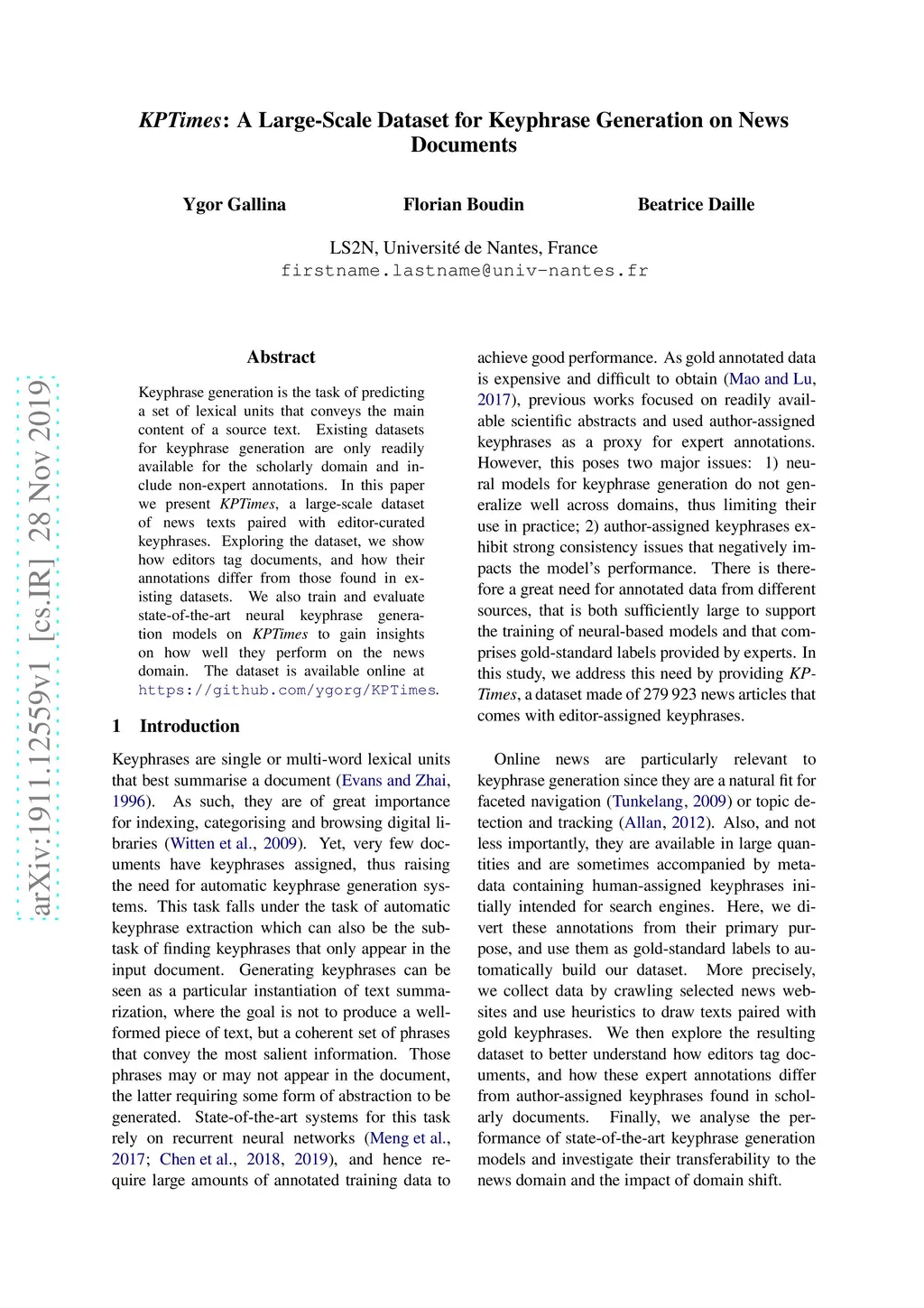 KPTimes: A Large-Scale Dataset for Keyphrase Generation on News