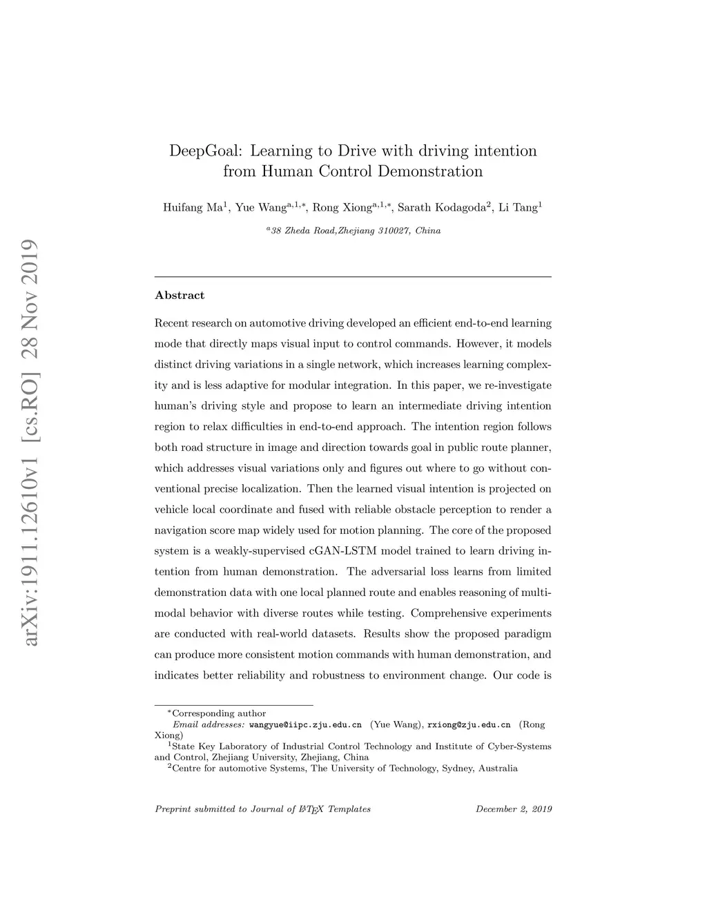 DeepGoal: Learning to Drive with driving intention from Human Control