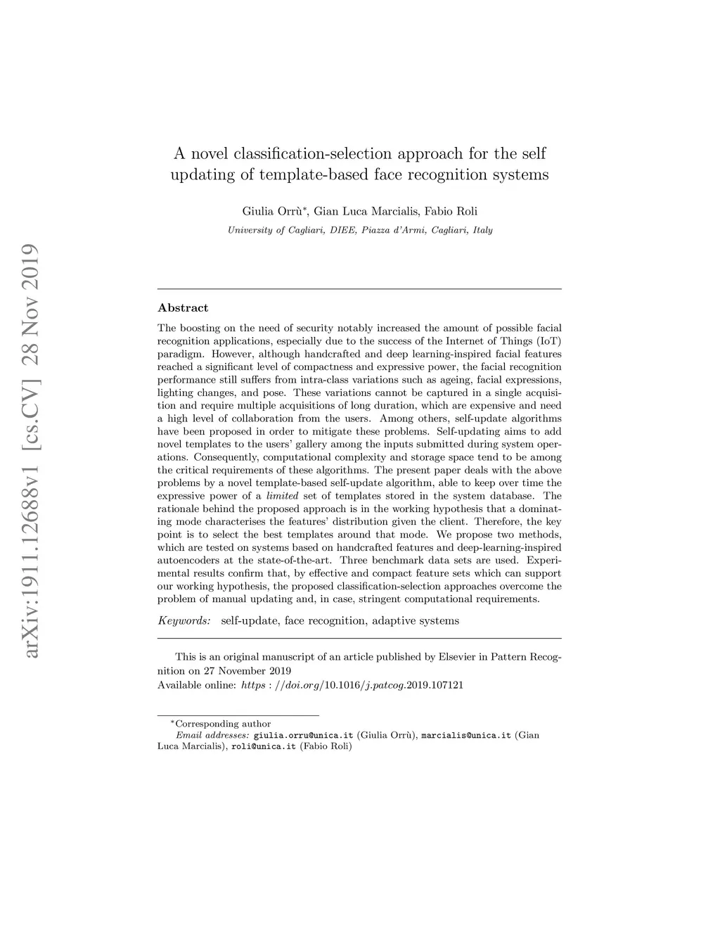 The boosting on the need of security notably increased the amount of possible facial recognition applications, especially due to the success of the Internet of Things (IoT) paradigm. However, although handcrafted and deep learning-inspired facial features reached a significant level of compactness and expressive power, the facial recognition performance still suffers from intra-class variations such as ageing, facial expressions, lighting changes, and pose. These variations cannot be captured in a single acquisition and require multiple acquisitions of long duration, which are expensive and need a high level of collaboration from the users. Among others, self-update algorithms have been proposed in order to mitigate these problems. Self-updating aims to add novel templates to the users' gallery among the inputs submitted during system operations. Consequently, computational complexity and storage space tend to be among the critical requirements of these algorithms. The present paper deals with the above problems by a novel template-based self-update algorithm, able to keep over time the expressive power of a limited set of templates stored in the system database. The rationale behind the proposed approach is in the working hypothesis that a dominating mode characterises the features' distribution given the client. Therefore, the key point is to select the best templates around that mode. We propose two methods, which are tested on systems based on handcrafted features and deep-learning-inspired autoencoders at the state-of-the-art. Three benchmark data sets are used. Experimental results confirm that, by effective and compact feature sets which can support our working hypothesis, the proposed classification-selection approaches overcome the problem of manual updating and, in case, stringent computational requirements.