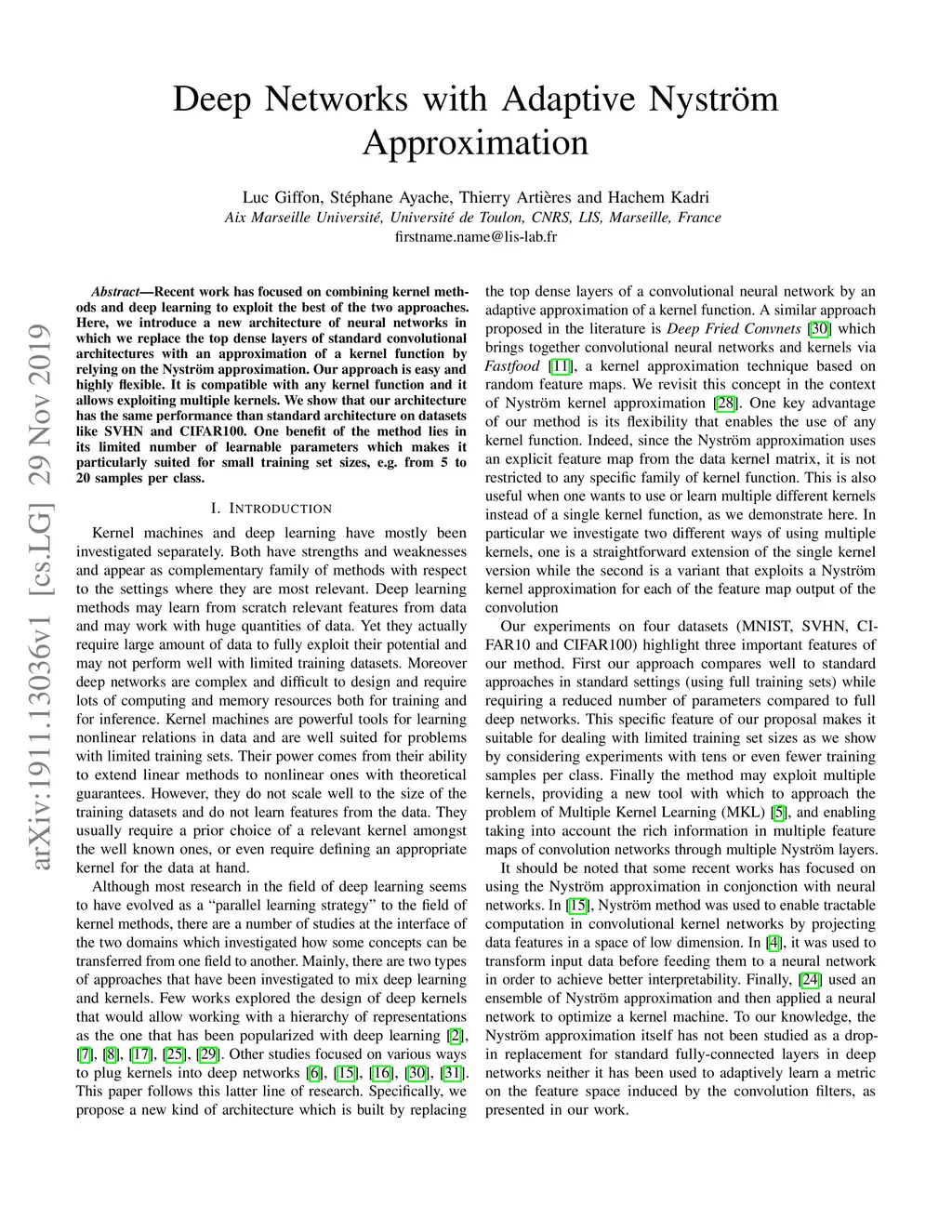 Recent work has focused on combining kernel methods and deep learning to exploit the best of the two approaches. Here, we introduce a new architecture of neural networks in which we replace the top dense layers of standard convolutional architectures with an approximation of a kernel function by relying on the Nystr{\"o}m approximation. Our approach is easy and highly flexible. It is compatible with any kernel function and it allows exploiting multiple kernels. We show that our architecture has the same performance than standard architecture on datasets like SVHN and CIFAR100. One benefit of the method lies in its limited number of learnable parameters which makes it particularly suited for small training set sizes, e.g. from 5 to 20 samples per class.