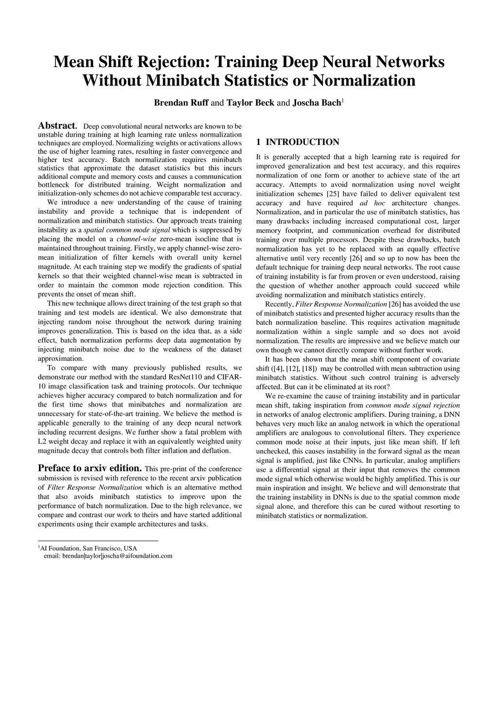 Deep convolutional neural networks are known to be unstable during training at high learning rate unless normalization techniques are employed. Normalizing weights or activations allows the use of higher learning rates, resulting in faster convergence and higher test accuracy. Batch normalization requires minibatch statistics that approximate the dataset statistics but this incurs additional compute and memory costs and causes a communication bottleneck for distributed training. Weight normalization and initialization-only schemes do not achieve comparable test accuracy. We introduce a new understanding of the cause of training instability and provide a technique that is independent of normalization and minibatch statistics. Our approach treats training instability as a spatial common mode signal which is suppressed by placing the model on a channel-wise zero-mean isocline that is maintained throughout training. Firstly, we apply channel-wise zero-mean initialization of filter kernels with overall unity kernel magnitude. At each training step we modify the gradients of spatial kernels so that their weighted channel-wise mean is subtracted in order to maintain the common mode rejection condition. This prevents the onset of mean shift. This new technique allows direct training of the test graph so that training and test models are identical. We also demonstrate that injecting random noise throughout the network during training improves generalization. This is based on the idea that, as a side effect, batch normalization performs deep data augmentation by injecting minibatch noise due to the weakness of the dataset approximation. Our technique achieves higher accuracy compared to batch normalization and for the first time shows that minibatches and normalization are unnecessary for state-of-the-art training.