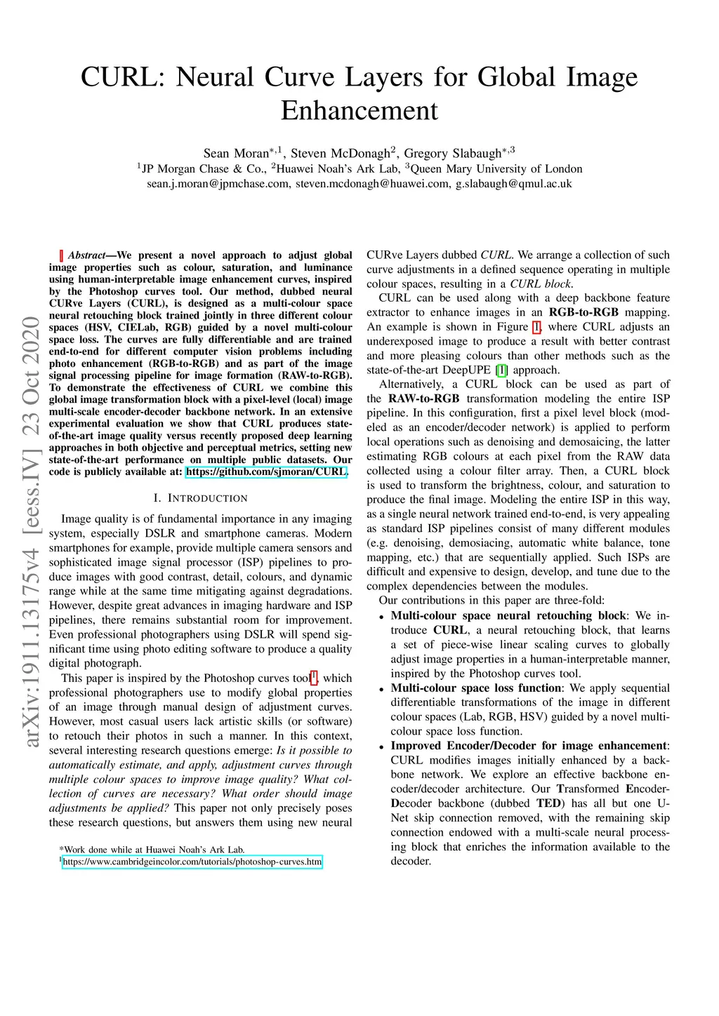 We present a novel approach to adjust global image properties such as colour, saturation, and luminance using human-interpretable image enhancement curves, inspired by the Photoshop curves tool. Our method, dubbed neural CURve Layers (CURL), is designed as a multi-colour space neural retouching block trained jointly in three different colour spaces (HSV, CIELab, RGB) guided by a novel multi-colour space loss. The curves are fully differentiable and are trained end-to-end for different computer vision problems including photo enhancement (RGB-to-RGB) and as part of the image signal processing pipeline for image formation (RAW-to-RGB). To demonstrate the effectiveness of CURL we combine this global image transformation block with a pixel-level (local) image multi-scale encoder-decoder backbone network. In an extensive experimental evaluation we show that CURL produces state-of-the-art image quality versus recently proposed deep learning approaches in both objective and perceptual metrics, setting new state-of-the-art performance on multiple public datasets. Our code is publicly available at: https://github.com/sjmoran/CURL.