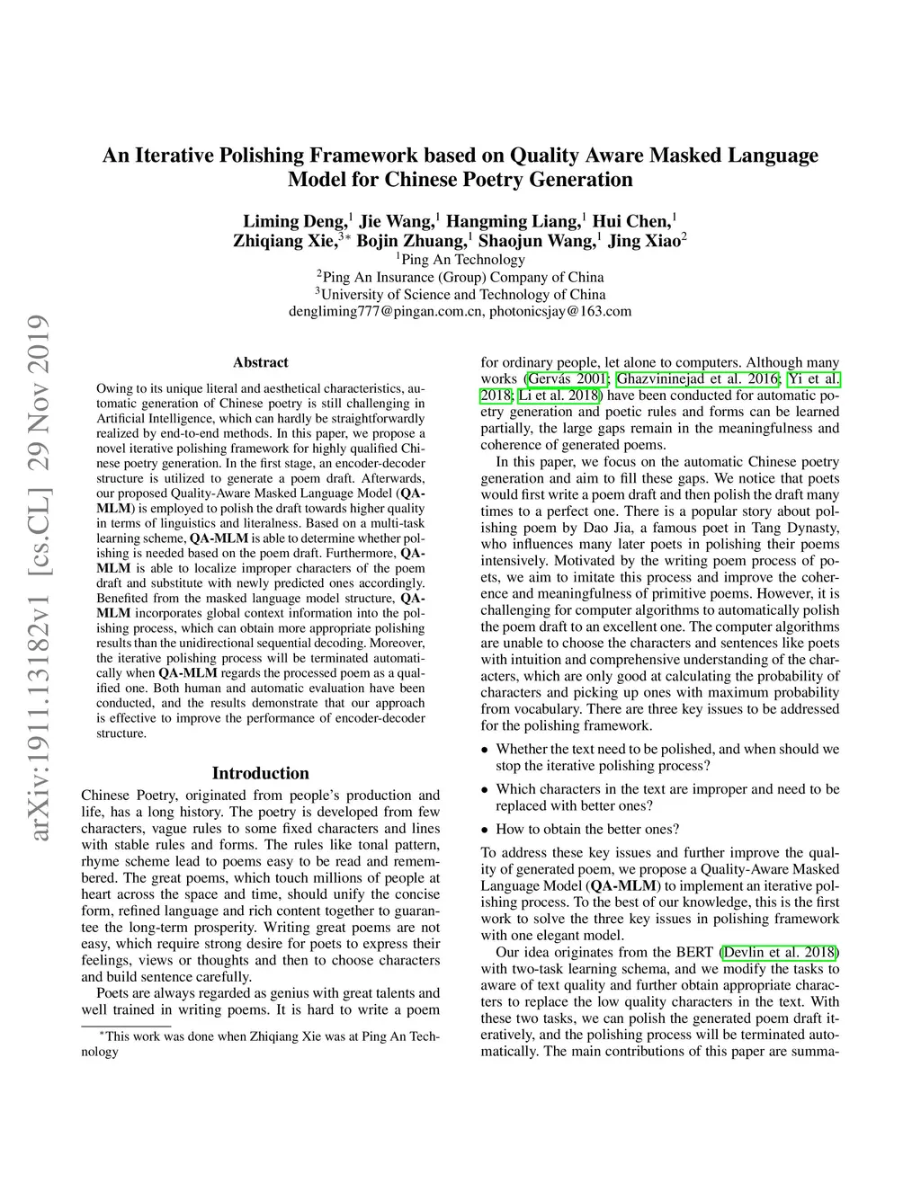Owing to its unique literal and aesthetical characteristics, automatic generation of Chinese poetry is still challenging in Artificial Intelligence, which can hardly be straightforwardly realized by end-to-end methods. In this paper, we propose a novel iterative polishing framework for highly qualified Chinese poetry generation. In the first stage, an encoder-decoder structure is utilized to generate a poem draft. Afterwards, our proposed Quality-Aware Masked Language Model (QAMLM) is employed to polish the draft towards higher quality in terms of linguistics and literalness. Based on a multi-task learning scheme, QA-MLM is able to determine whether polishing is needed based on the poem draft. Furthermore, QAMLM is able to localize improper characters of the poem draft and substitute with newly predicted ones accordingly. Benefited from the masked language model structure, QAMLM incorporates global context information into the polishing process, which can obtain more appropriate polishing results than the unidirectional sequential decoding. Moreover, the iterative polishing process will be terminated automatically when QA-MLM regards the processed poem as a qualified one. Both human and automatic evaluation have been conducted, and the results demonstrate that our approach is effective to improve the performance of encoder-decoder structure.