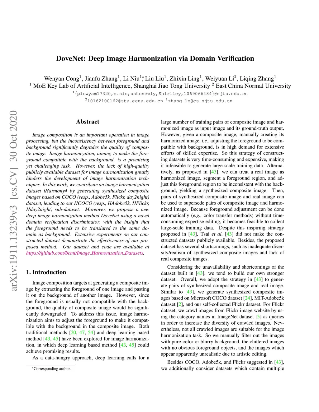 Image composition is an important operation in image processing, but the inconsistency between foreground and background significantly degrades the quality of composite image. Image harmonization, aiming to make the foreground compatible with the background, is a promising yet challenging task. However, the lack of high-quality publicly available dataset for image harmonization greatly hinders the development of image harmonization techniques. In this work, we contribute an image harmonization dataset iHarmony4 by generating synthesized composite images based on COCO (resp., Adobe5k, Flickr, day2night) dataset, leading to our HCOCO (resp., HAdobe5k, HFlickr, Hday2night) sub-dataset. Moreover, we propose a new deep image harmonization method DoveNet using a novel domain verification discriminator, with the insight that the foreground needs to be translated to the same domain as background. Extensive experiments on our constructed dataset demonstrate the effectiveness of our proposed method. Our dataset and code are available at https://github.com/bcmi/Image_Harmonization_Datasets.