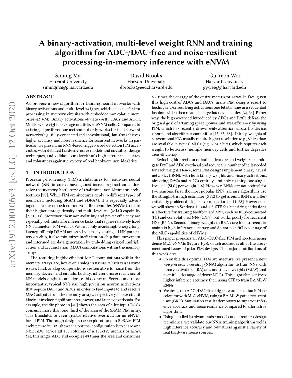 We propose a new algorithm for training neural networks with binary activations and multi-level weights, which enables efficient processing-in-memory circuits with embedded nonvolatile memories (eNVM). Binary activations obviate costly DACs and ADCs. Multi-level weights leverage multi-level eNVM cells. Compared to existing algorithms, our method not only works for feed-forward networks (e.g., fully-connected and convolutional), but also achieves higher accuracy and noise resilience for recurrent networks. In particular, we present an RNN-based trigger-word detection PIM accelerator, with detailed hardware noise models and circuit co-design techniques, and validate our algorithm's high inference accuracy and robustness against a variety of real hardware non-idealities.