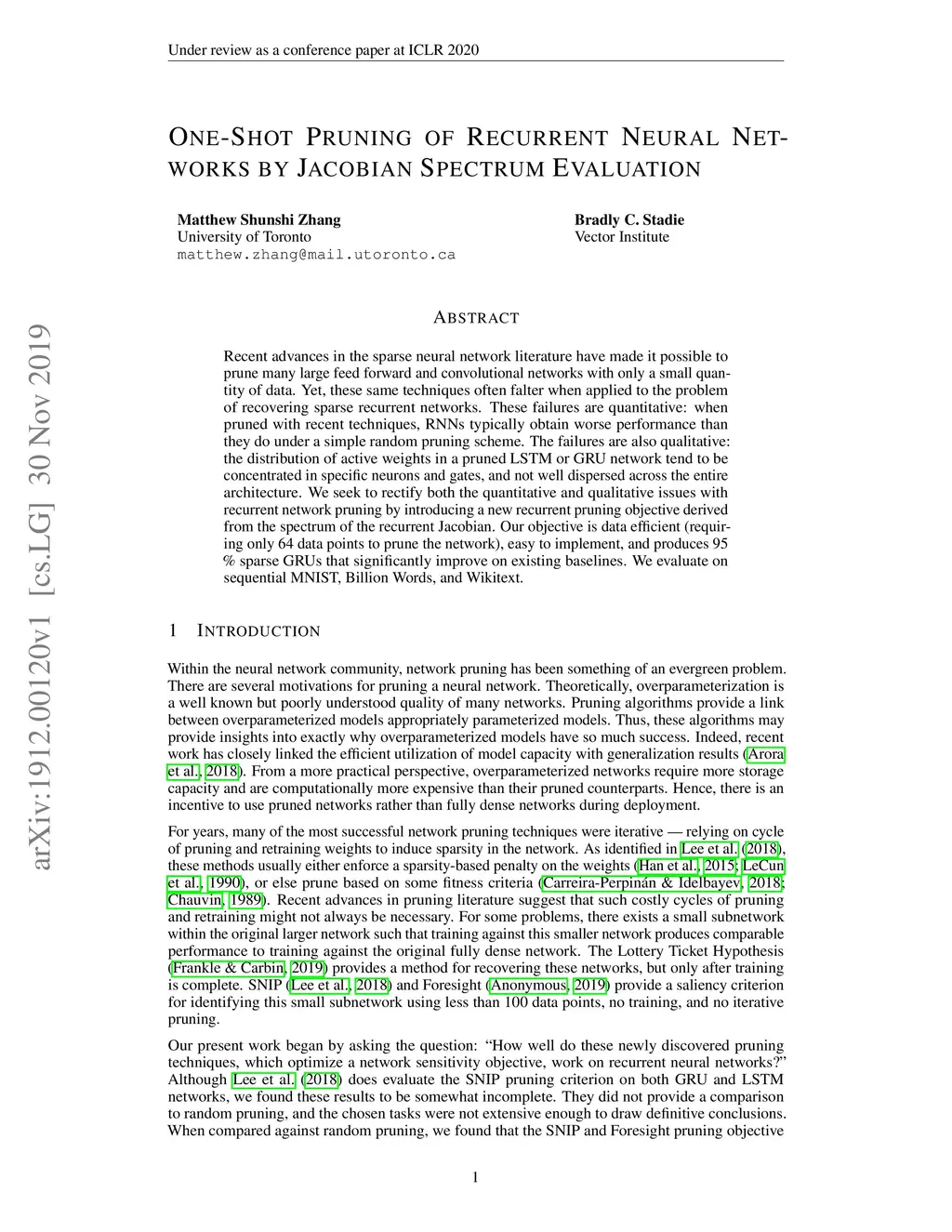 One-Shot Pruning of Recurrent Neural Networks by Jacobian Spectrum
