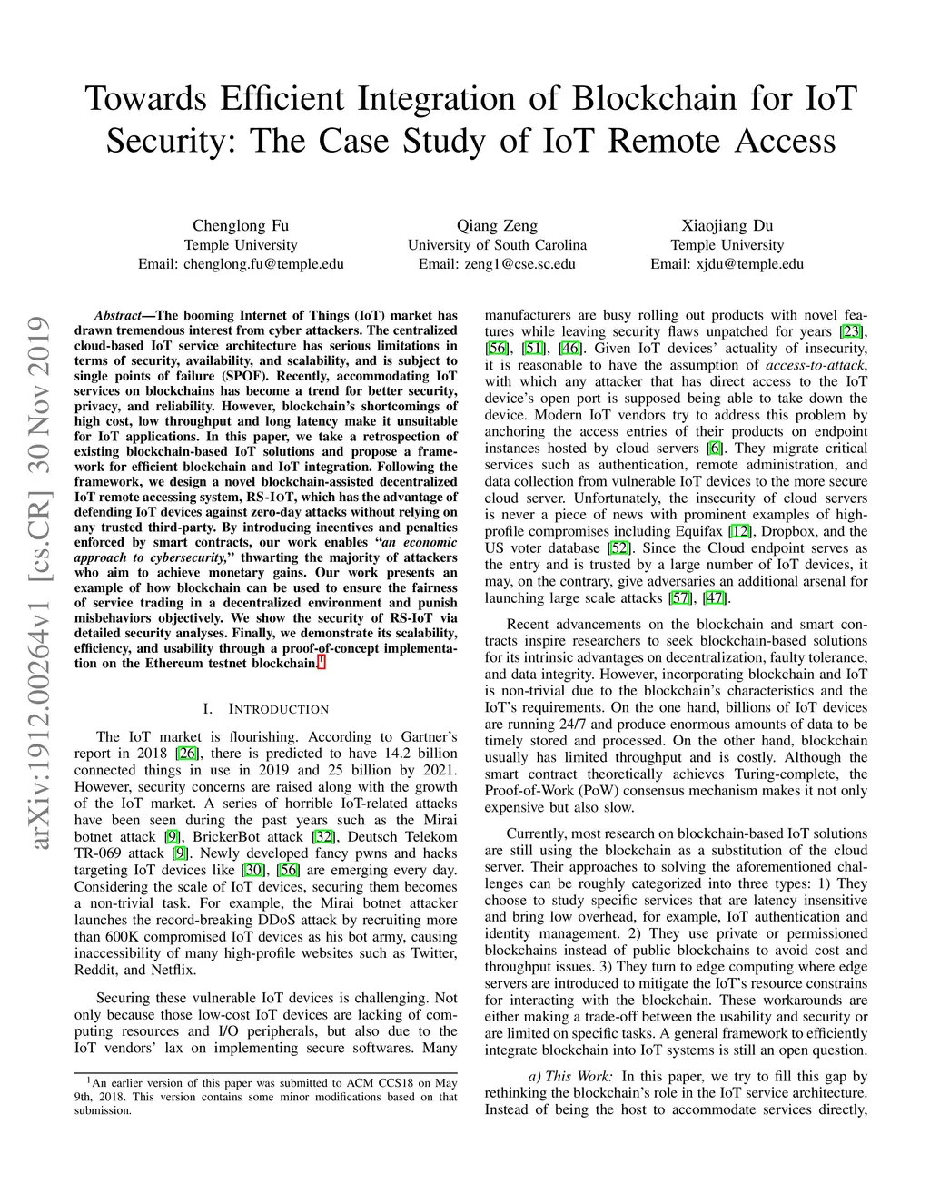 The booming Internet of Things (IoT) market has drawn tremendous interest from cyber attackers. The centralized cloud-based IoT service architecture has serious limitations in terms of security, availability, and scalability, and is subject to single points of failure (SPOF). Recently, accommodating IoT services on blockchains has become a trend for better security, privacy, and reliability. However, blockchain's shortcomings of high cost, low throughput, and long latency make it unsuitable for IoT applications. In this paper, we take a retrospection of existing blockchain-based IoT solutions and propose a framework for efficient blockchain and IoT integration. Following the framework, we design a novel blockchain-assisted decentralized IoT remote accessing system, RS-IoT, which has the advantage of defending IoT devices against zero-day attacks without relying on any trusted third-party. By introducing incentives and penalties enforced by smart contracts, our work enables "an economic approach" to thwarting the majority of attackers who aim to achieve monetary gains. Our work presents an example of how blockchain can be used to ensure the fairness of service trading in a decentralized environment and punish misbehaviors objectively. We show the security of RS-IoT via detailed security analyses. Finally, we demonstrate its scalability, efficiency, and usability through a proof-of-concept implementation on the Ethereum testnet blockchain.