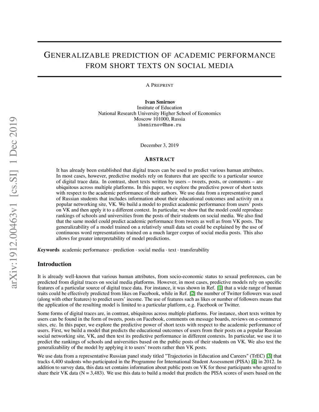 It has already been established that digital traces can be used to predict various human attributes. In most cases, however, predictive models rely on features that are specific to a particular source of digital trace data. In contrast, short texts written by users tweets, posts, or comments are ubiquitous across multiple platforms. In this paper, we explore the predictive power of short texts with respect to the academic performance of their authors. We use data from a representative panel of Russian students that includes information about their educational outcomes and activity on a popular networking site, VK. We build a model to predict academic performance from users' posts on VK and then apply it to a different context. In particular, we show that the model could reproduce rankings of schools and universities from the posts of their students on social media. We also find that the same model could predict academic performance from tweets as well as from VK posts. The generalizability of a model trained on a relatively small data set could be explained by the use of continuous word representations trained on a much larger corpus of social media posts. This also allows for greater interpretability of model predictions.