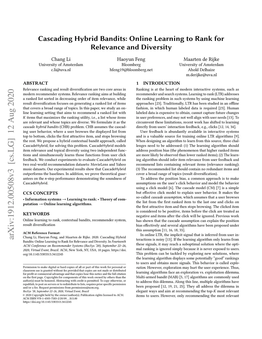 Relevance ranking and result diversification are two core areas in modern recommender systems. Relevance ranking aims at building a ranked list sorted in decreasing order of item relevance, while result diversification focuses on generating a ranked list of items that covers a broad range of topics. In this paper, we study an online learning setting that aims to recommend a ranked list with items that maximizes the ranking utility, i.e., a list whose items are relevant and whose topics are diverse. We formulate it as the cascade hybrid bandits (CHB) problem. CHB assumes the cascading user behavior, where a user browses the displayed list from top to bottom, clicks the first attractive item, and stops browsing the rest. We propose a hybrid contextual bandit approach, called CascadeHybrid, for solving this problem. CascadeHybrid models item relevance and topical diversity using two independent functions and simultaneously learns those functions from user click feedback. We conduct experiments to evaluate CascadeHybrid on two real-world recommendation datasets: MovieLens and Yahoo music datasets. Our experimental results show that CascadeHybrid outperforms the baselines. In addition, we prove theoretical guarantees on the -step performance demonstrating the soundness of CascadeHybrid.