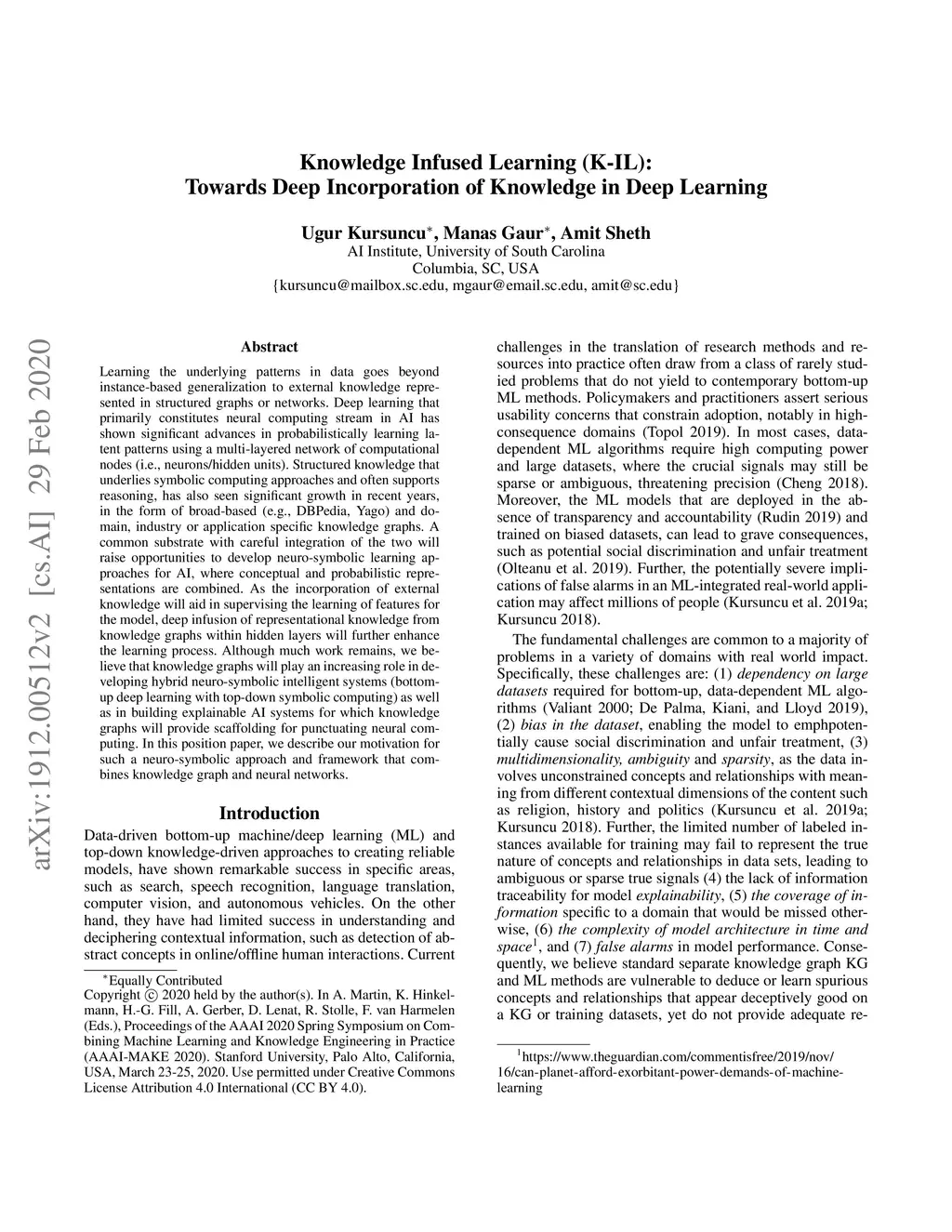 Learning the underlying patterns in data goes beyond instance-based generalization to external knowledge represented in structured graphs or networks. Deep learning that primarily constitutes neural computing stream in AI has shown significant advances in probabilistically learning latent patterns using a multi-layered network of computational nodes (i.e., neurons/hidden units). Structured knowledge that underlies symbolic computing approaches and often supports reasoning, has also seen significant growth in recent years, in the form of broad-based (e.g., DBPedia, Yago) and domain, industry or application specific knowledge graphs. A common substrate with careful integration of the two will raise opportunities to develop neuro-symbolic learning approaches for AI, where conceptual and probabilistic representations are combined. As the incorporation of external knowledge will aid in supervising the learning of features for the model, deep infusion of representational knowledge from knowledge graphs within hidden layers will further enhance the learning process. Although much work remains, we believe that knowledge graphs will play an increasing role in developing hybrid neuro-symbolic intelligent systems (bottom-up deep learning with top-down symbolic computing) as well as in building explainable AI systems for which knowledge graphs will provide scaffolding for punctuating neural computing. In this position paper, we describe our motivation for such a neuro-symbolic approach and framework that combines knowledge graph and neural networks.