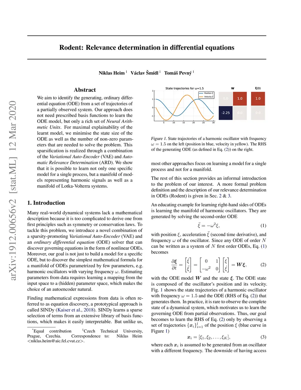 We aim to identify the generating, ordinary differential equation (ODE) from a set of trajectories of a partially observed system. Our approach does not need prescribed basis functions to learn the ODE model, but only a rich set of Neural Arithmetic Units. For maximal explainability of the learnt model, we minimise the state size of the ODE as well as the number of non-zero parameters that are needed to solve the problem. This sparsification is realized through a combination of the Variational Auto-Encoder (VAE) and Automatic Relevance Determination (ARD). We show that it is possible to learn not only one specific model for a single process, but a manifold of models representing harmonic signals as well as a manifold of Lotka-Volterra systems.