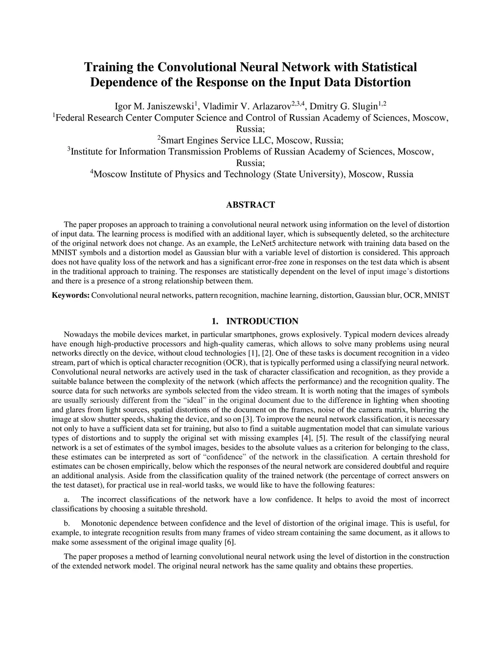 The paper proposes an approach to training a convolutional neural network using information on the level of distortion of input data. The learning process is modified with an additional layer, which is subsequently deleted, so the architecture of the original network does not change. As an example, the LeNet5 architecture network with training data based on the MNIST symbols and a distortion model as Gaussian blur with a variable level of distortion is considered. This approach does not have quality loss of the network and has a significant error-free zone in responses on the test data which is absent in the traditional approach to training. The responses are statistically dependent on the level of input image's distortions and there is a presence of a strong relationship between them.