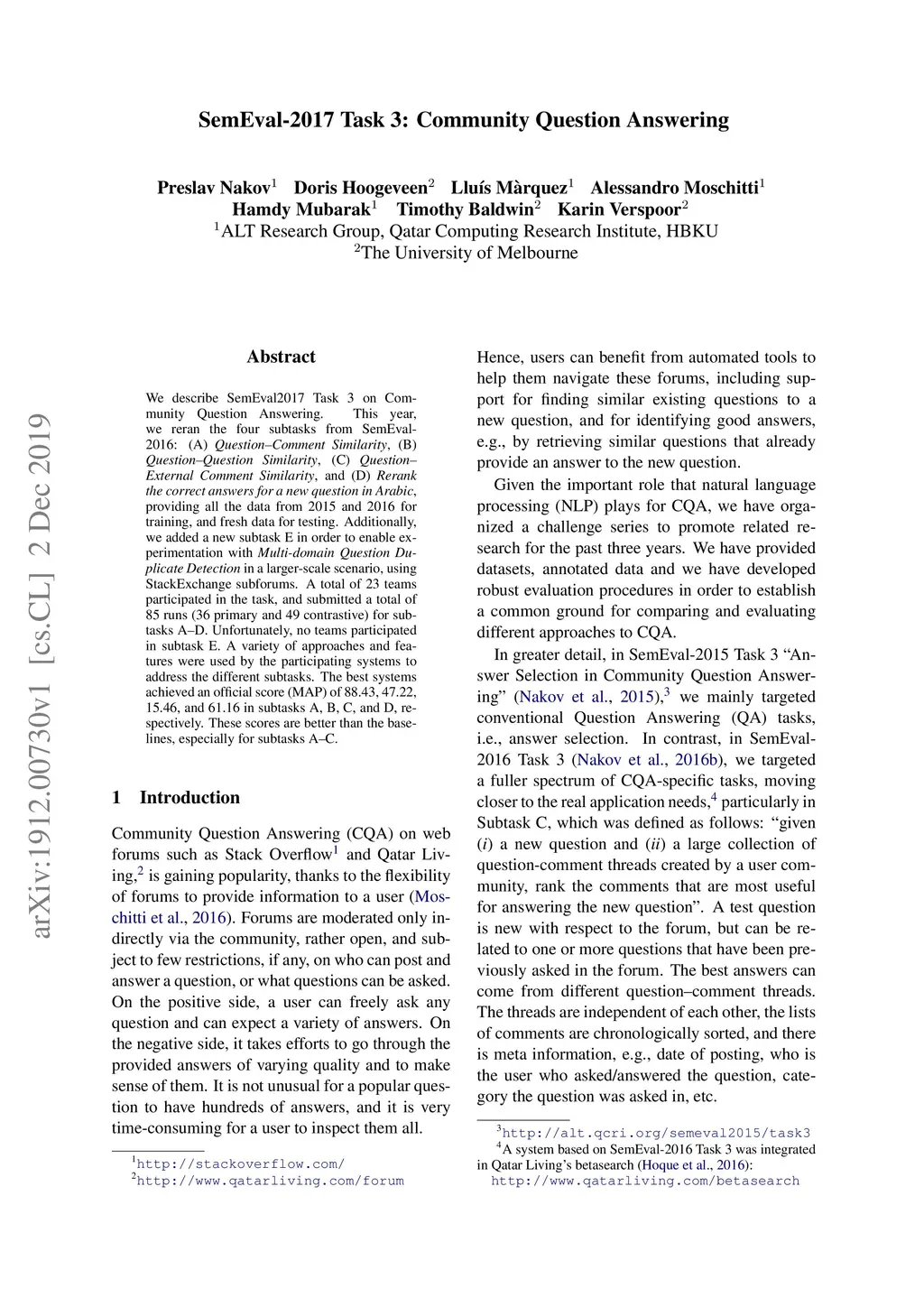 SemEval-2017 Task 3: Community Question Answering
