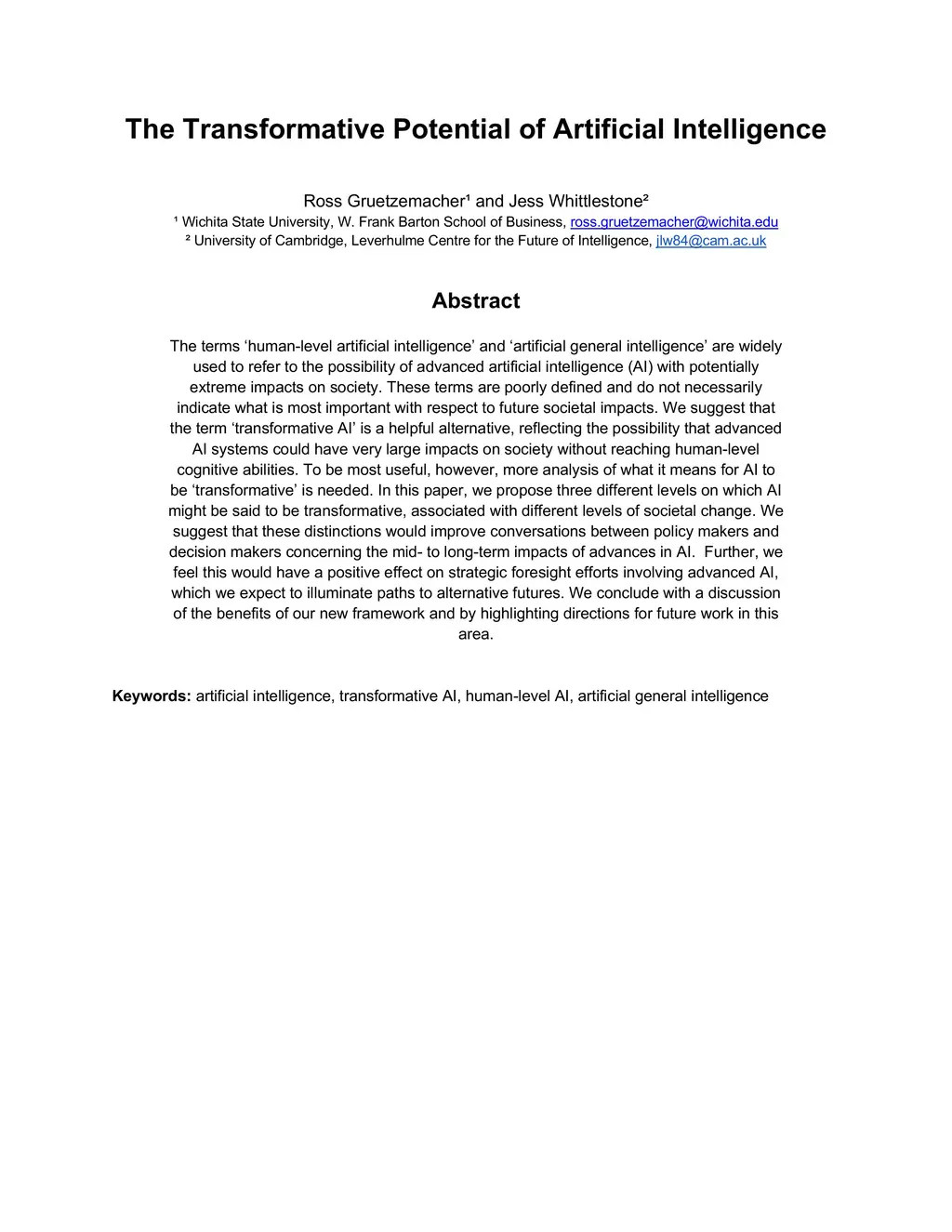 The terms 'human-level artificial intelligence' and ártificial general intelligence' are widely used to refer to the possibility of advanced artificial intelligence (AI) with potentially extreme impacts on society. These terms are poorly defined and do not necessarily indicate what is most important with respect to future societal impacts. We suggest that the term 'transformative AI' is a helpful alternative, reflecting the possibility that advanced AI systems could have very large impacts on society without reaching human-level cognitive abilities. To be most useful, however, more analysis of what it means for AI to be 'transformative' is needed. In this paper, we propose three different levels on which AI might be said to be transformative, associated with different levels of societal change. We suggest that these distinctions would improve conversations between policy makers and decision makers concerning the mid- to long-term impacts of advances in AI. Further, we feel this would have a positive effect on strategic foresight efforts involving advanced AI, which we expect to illuminate paths to alternative futures. We conclude with a discussion of the benefits of our new framework and by highlighting directions for future work in this area.